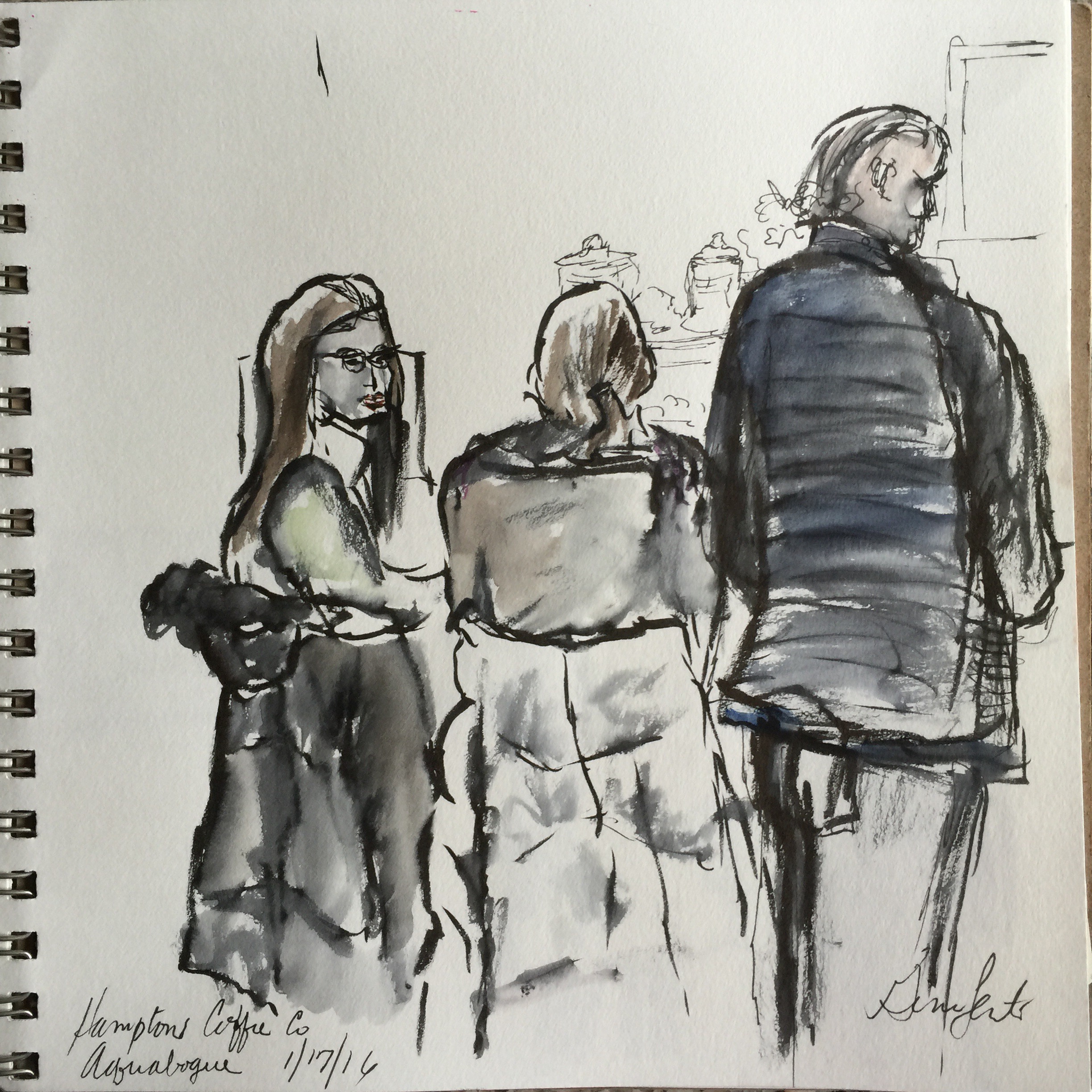 Sketches today at the Hamptons Coffee Company’s new place in Aquabogue. I love the brush pen with the non-waterproof ink but it’s not good when it bleeds in places like faces, where I don’t want it to. I might have to get a 2nd pen and put waterproof ink in it for faces. They have 4 locations. It’s a great place with really good coffee and Coffee shops where you can sit and watch people socialize are a great place to sketch.