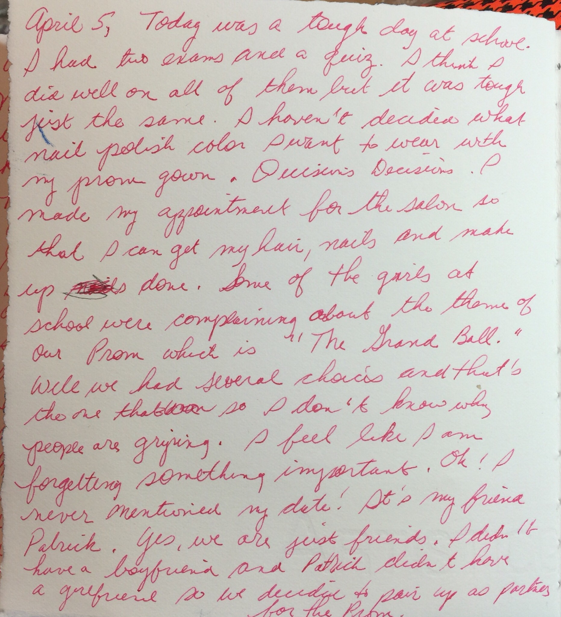 April 5, Today was a tough day at school. I had two exams and a quiz. I think I did well on all of them but it was tough just the same. I haven’t decided what nail polish color I want to wear with my prom gown. Decisions Decisions. I made my appointment for the salon so that I can get my hair, nails and make up done. Some of the girls at school were complaining about the theme of our prom which is “The Grand Ball.” Well we all had several choices and that’s the one that won so I don’t know why people are griping. I feel like I am forgetting something important. Oh! I never mentioned my date! It’s my friend Patrick. Yes, we are just friends. I didn’t have a boyfriend and Patrick didn’t have a girlfriend so we decided to pair up as partners for the Prom.