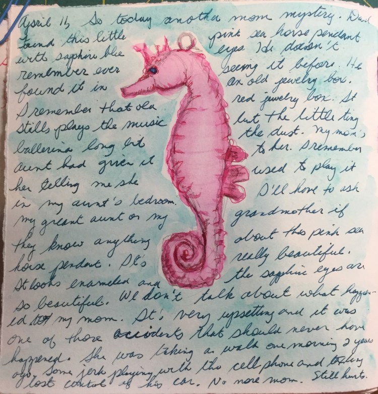 April 11, So today another mom mystery. Dad found this little pink sea horse pendant with sapphire blue eyes. He doesn’t remember ever seeing it before. He found it in an old jewelry box. I remember that old red jewelry box. It still plays the music but the little tiny ballerina bit the dust. My mom’s aunt had given it to her. I remember her telling me she used to play with it in my aunt’s bedroom. I’ll have to ask my great aunt or my grandmother if they know anything about this pink sea horse pendant. It’s really beautiful. It looks enameled and the sapphire eyes are so beautiful. We don’t talk about what happened to my mom. It’s very upsetting and it was one of those accidents that should never have happened. She was taking a walk one morning, 2 years ago. Some jerk playing with his cell phone and texting lost control of his car. No more mom. Still hurts.