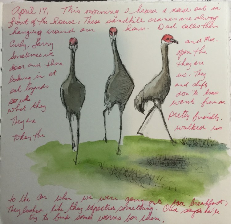 April 17,….this morning I heard a noise out in front of the house. These Sandhill cranes are always hanging around our house. Dad calls them Curly, Larry and Moe. Sometimes we open the door and there they are looking in at us. They eat lizards and stuff so we don’t know what they want from us. They are pretty friendly. Today they walked us to the car when we were going out for breakfast. They looked like they expected something. Dad said he’ll try to find some worms for them.