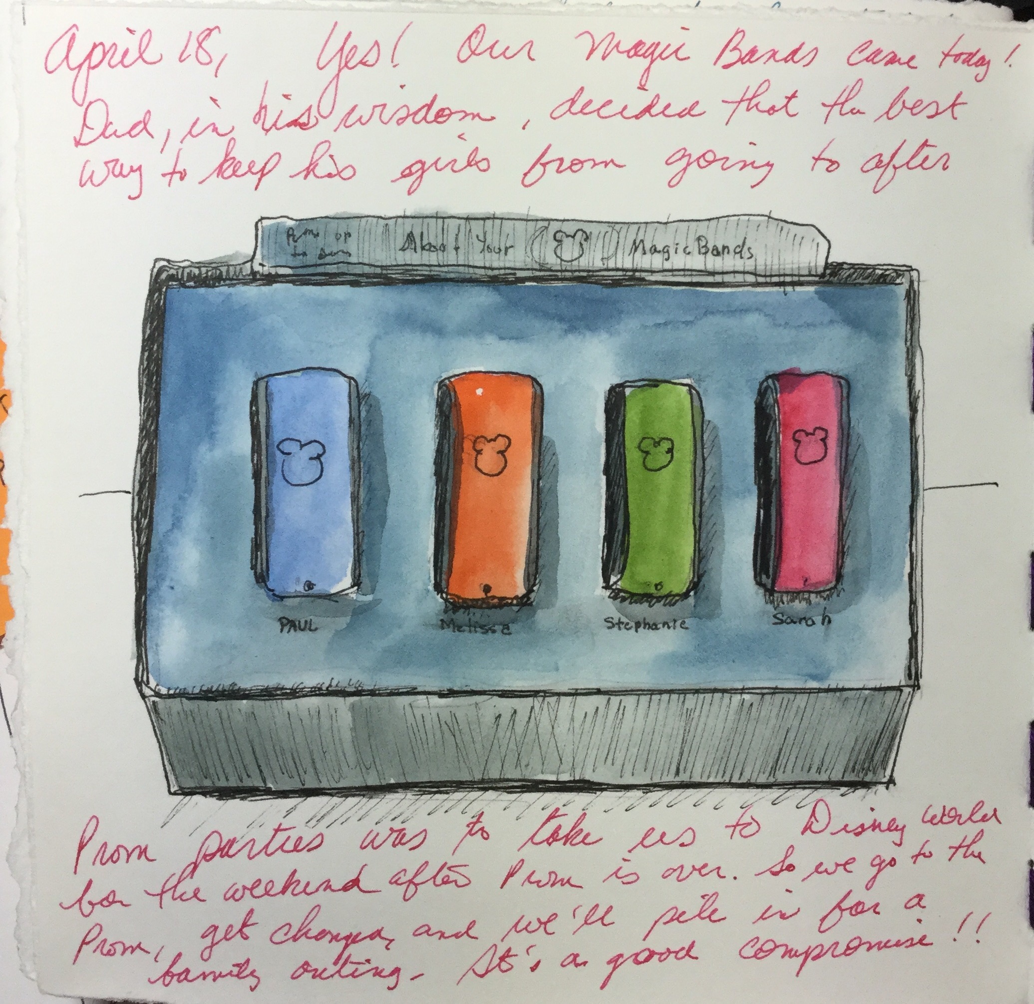 April 18, Yes! Our Magic Bands came today! Dad, in his wisdom, decided that the best way to keep his girls from going to after Prom parties was to take us to Disney World for the weekend after Prom is over. So we go to the Prom, get changed, and we’ll pile in for a family outing. It’s a good compromise!