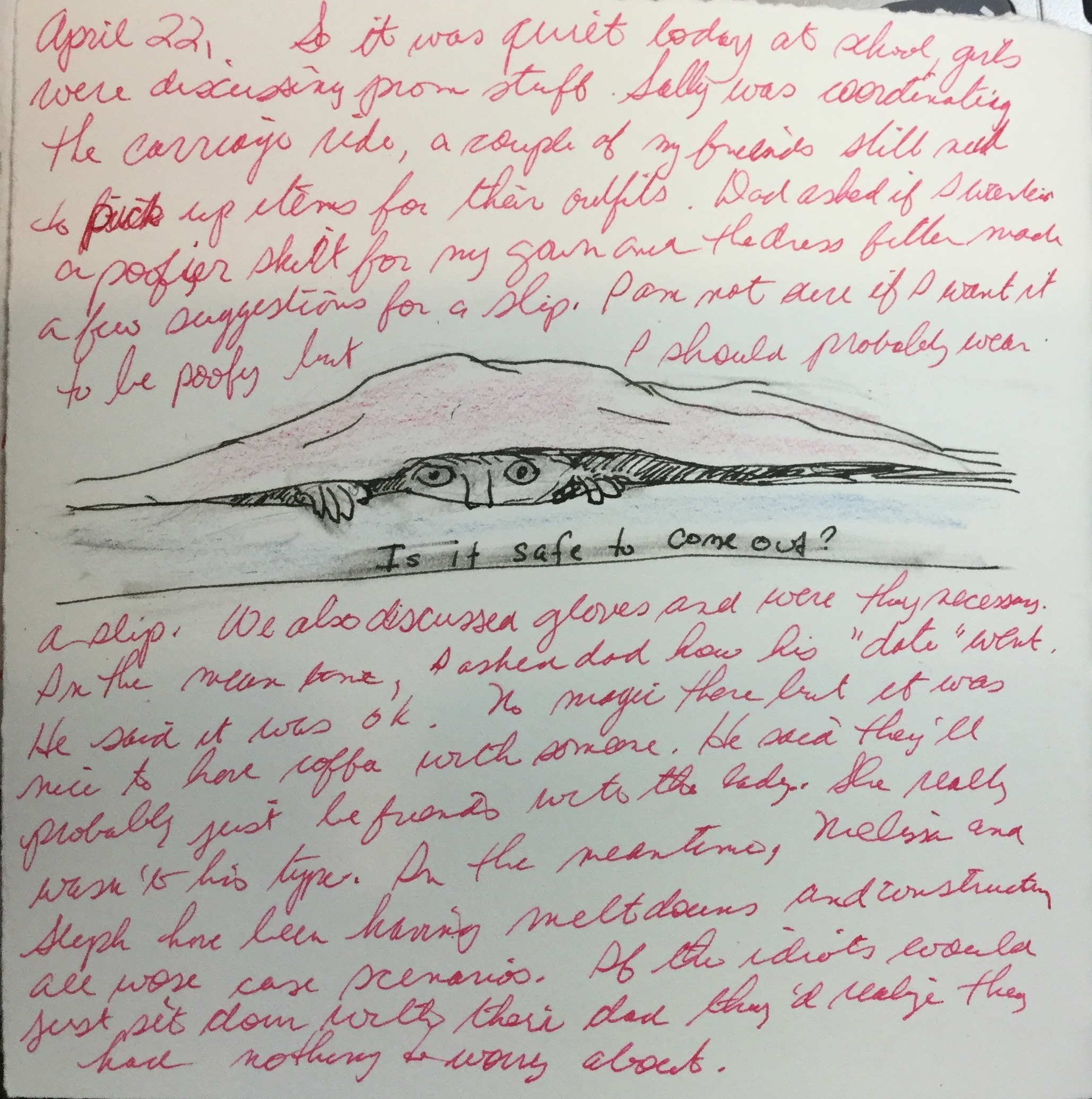 April 22, so it was quiet today at school, girls were discussing prom stuff. Sally was coordinating the carriage ride, a couple of my friends still need to pick up items for their outfits. Dad asked if I wanted a poofier skirt for my gown and the dress fitter made a few suggestions for a slip. I am not sure if I want it to be poofy, but I should probably wear a slip. We also discussed gloves and were they necessary. In the meantime, I asked dad how his “date” went. He said it was ok. No magic there but it was nice to have coffee with someone. He said he’ll probably just be friends with the lady. She really wasn’t his type. In the meantime, Melissa and Steph have been having meltdowns and constructing all worse case scenarios. If the idiots would just sit down with their dad, they’d realize they had nothing to worry about.