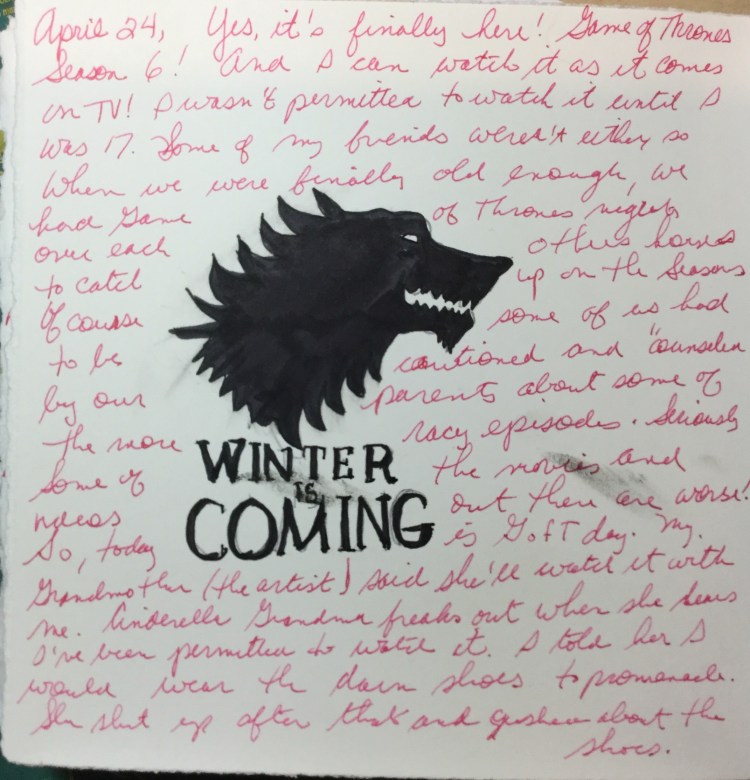 April 24, Yes, it’s finally here! Game of Thrones Season 6. And I can watch it as it comes on TV. I wasn’t permitted to watch it until I was 17. Some of my friends weren’t either so when we were finally old enough, we had Game of Thrones nights over each other’s houses to catch up on the seasons. Of course, some of us had to be “counseled” by our parents about some of the more racy episodes. Seriously?! Some of the movies and videos out there are far worse! So, today is G of T day. My grandmother (the artist) said she’ll watch it with me. Cinderella Grandma freaks out when she hears I’ve been permitted to watch it. I told her I would wear the darn shoes to Promenade. She shut up after that and gushed about the shoes.