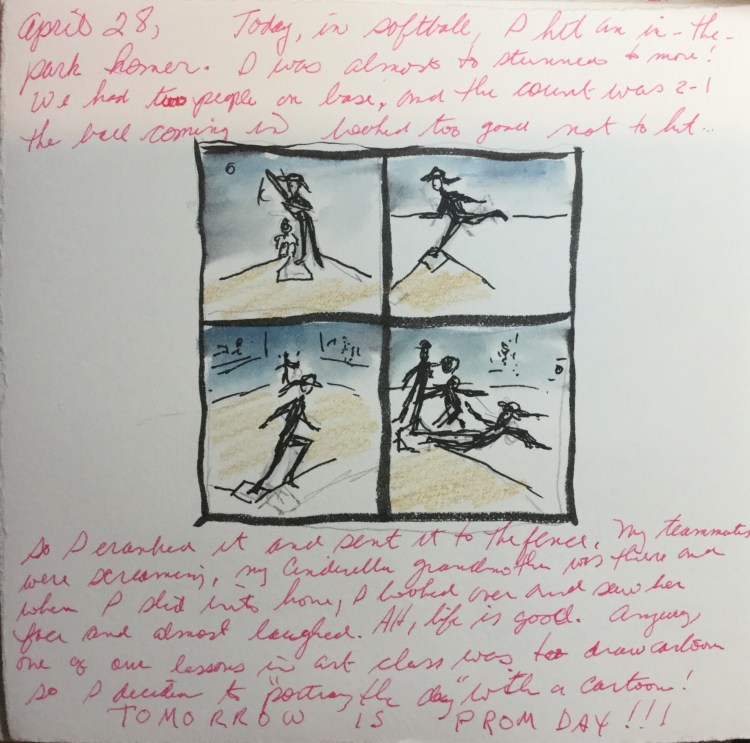 April 28…today, in softball, I hit an in-the-park homer. I was almost to stunned to move! We had two people on base, and the count was 2-1, the ball coming in was too good not to hit. So I cranked it and sent it flying to the fence. My teammates were screaming, my Cinderella Grandmother was there and when I slid into home, I looked over and saw her face and almost laughed. Ah, life is good. Anyway, one of our lessons in art class was to draw cartoons so I decided to “portray the day” with a cartoon! TOMORROW IS PROM DAY!