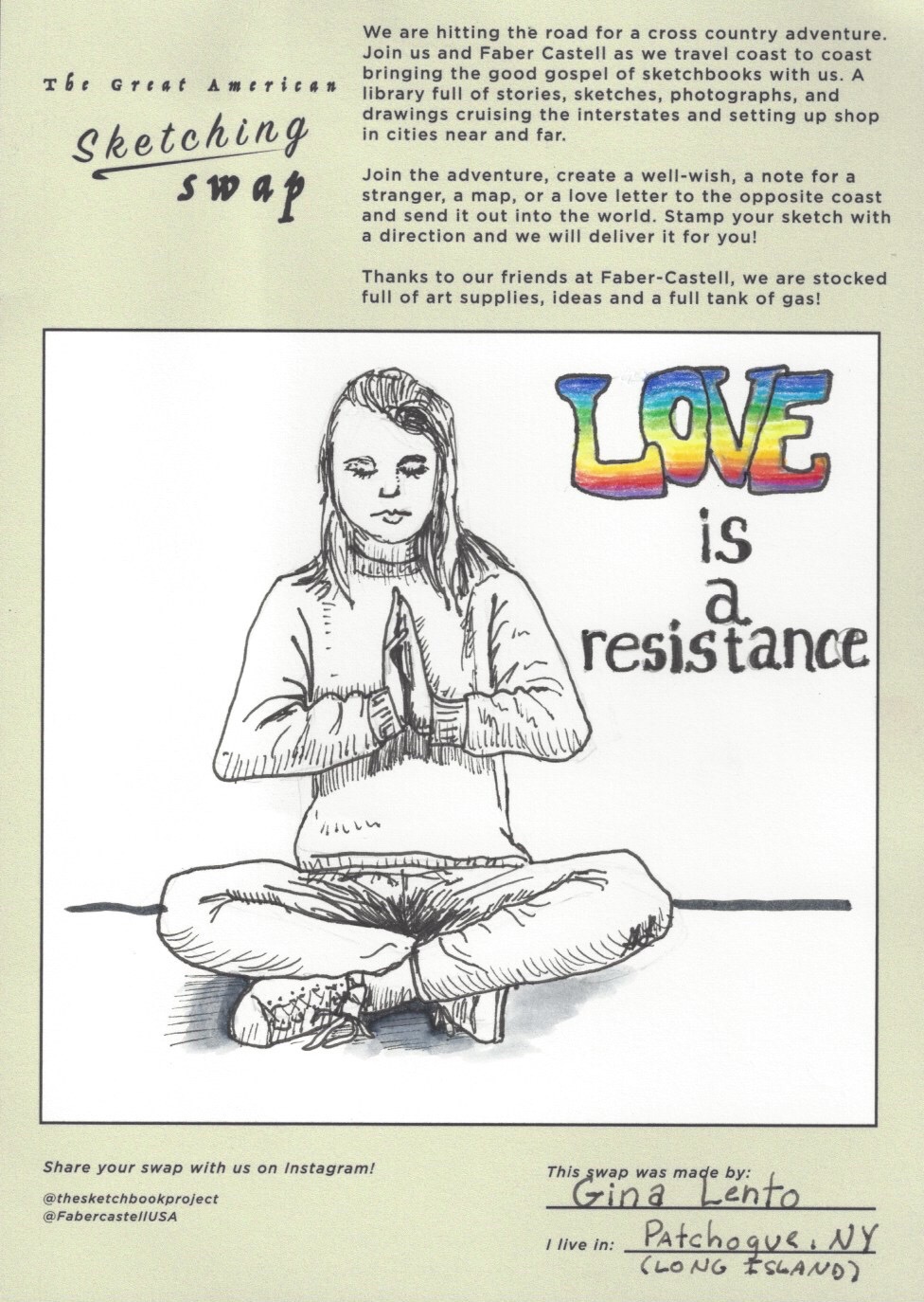 So, signed up with the Sketchbook Project to do a sketch swap. I scrolled through a bunch of photos, and something about this one really clicked. I didn’t start out with anything in mind but it just grew into “Love is a Resistance”. The phrase is something I think I heard in a Muse song, but with everything going on in this country and this world, I thought the title was appropriate. If you watch the new “Independence Day” movie, you’ll see that we are truly one people, one species that should be protecting this planet, not destroying it to fight over dirt and sand or differences of opinion or beliefs. So thank you for posting this photo of peace. The sketch will be traveling with the Sketchbook Project.