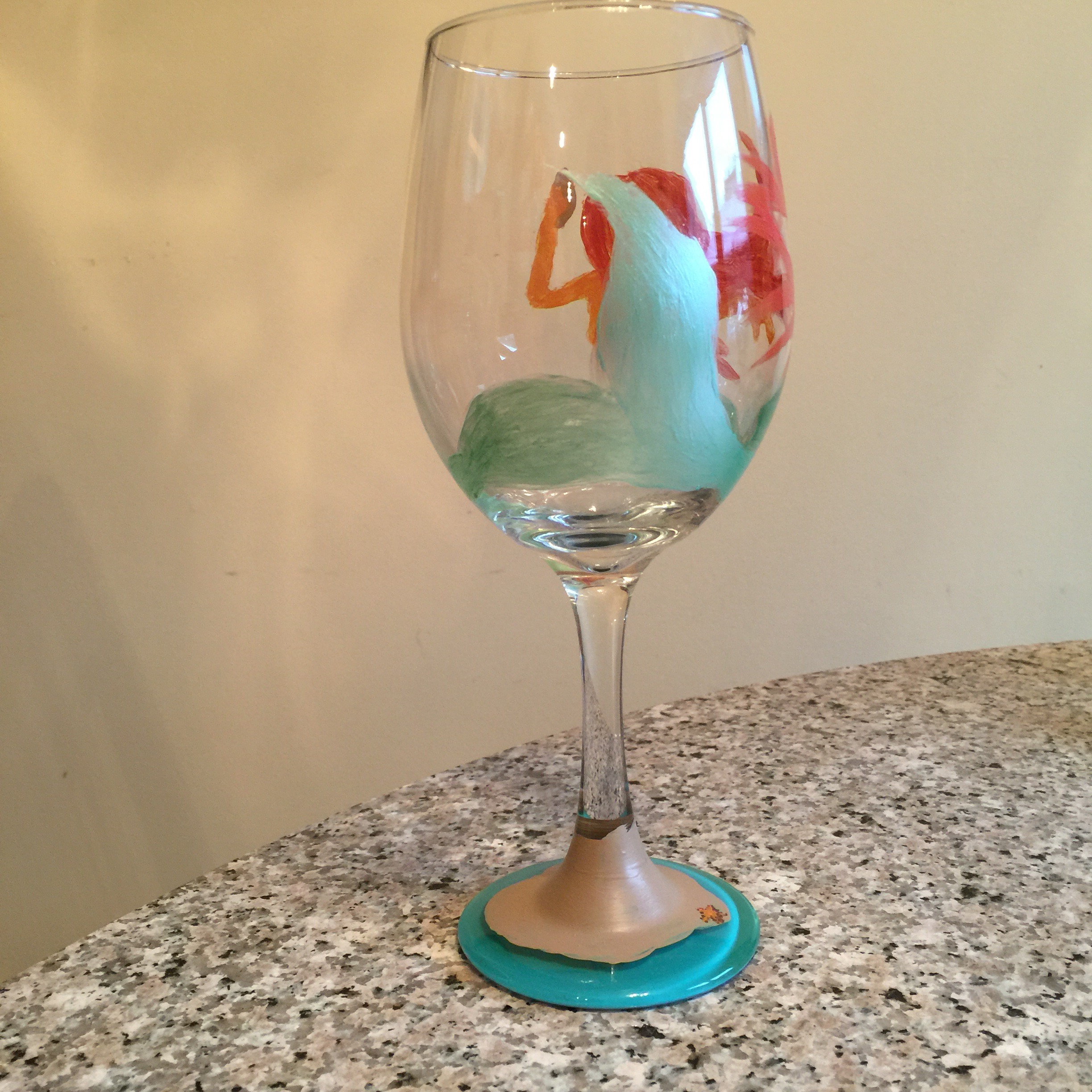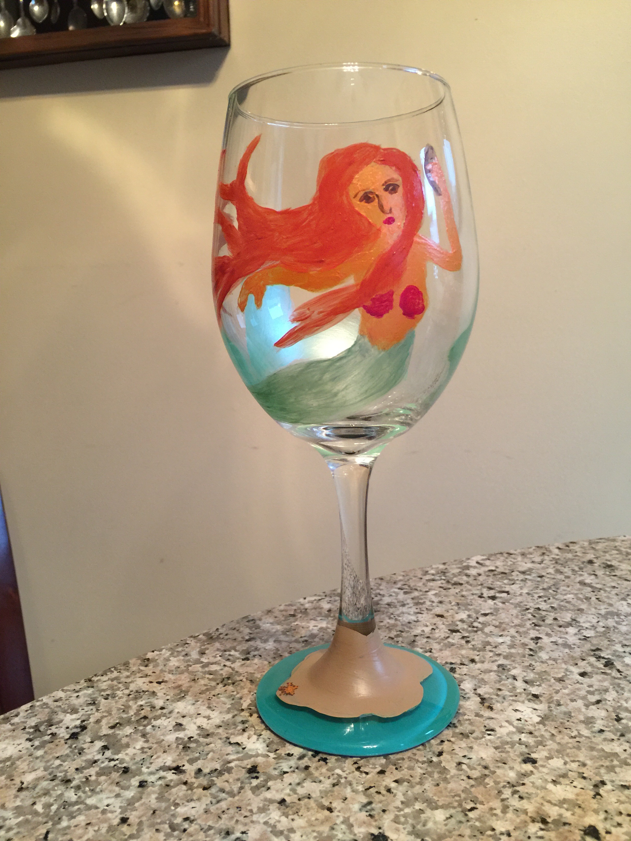 Then, there are my wine glasses….I had to do a mermaid….here are front and back shots plus the sculpture that inspired the glass…