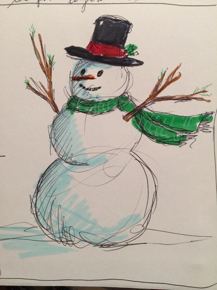 I have been up to my eyeballs with holiday activities and I have been really lax on my posts. I have a lot of sketches to post and I will be following up shortly with my other sketches. I just wanted to get this out this evening before midnight….lol. I did this early this morning with my morning pages…I have been trying to fill up a few sketchbooks before the end of the year. For some reason I started to do a bunch of snowmen and this one was my favorite….it was done with a Bic pen and Tombow markers.