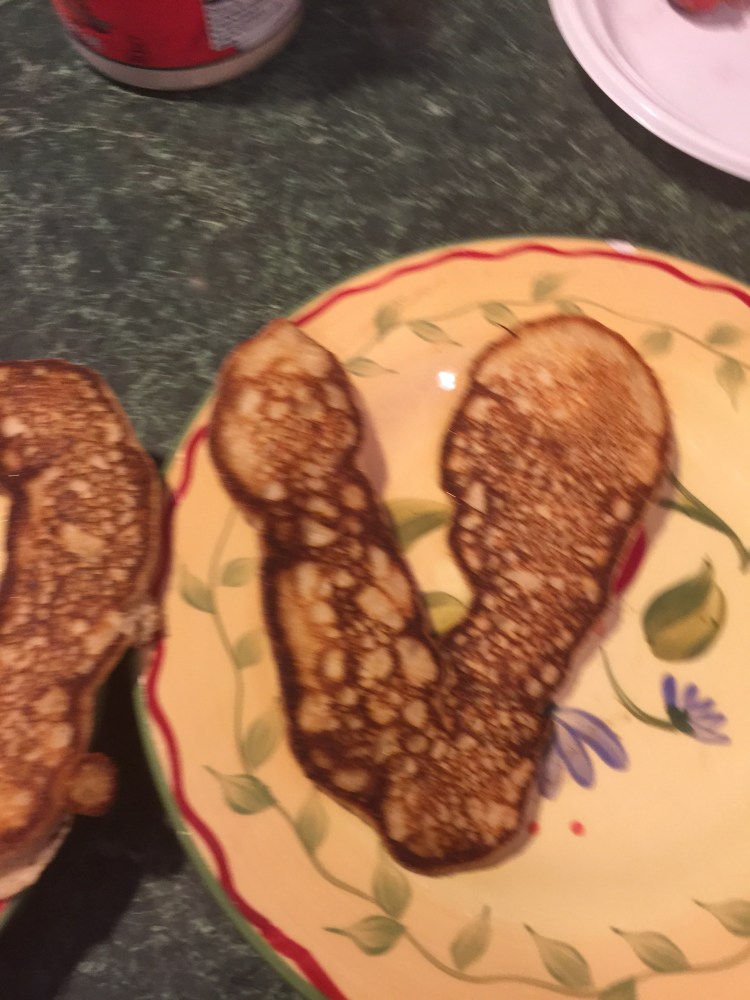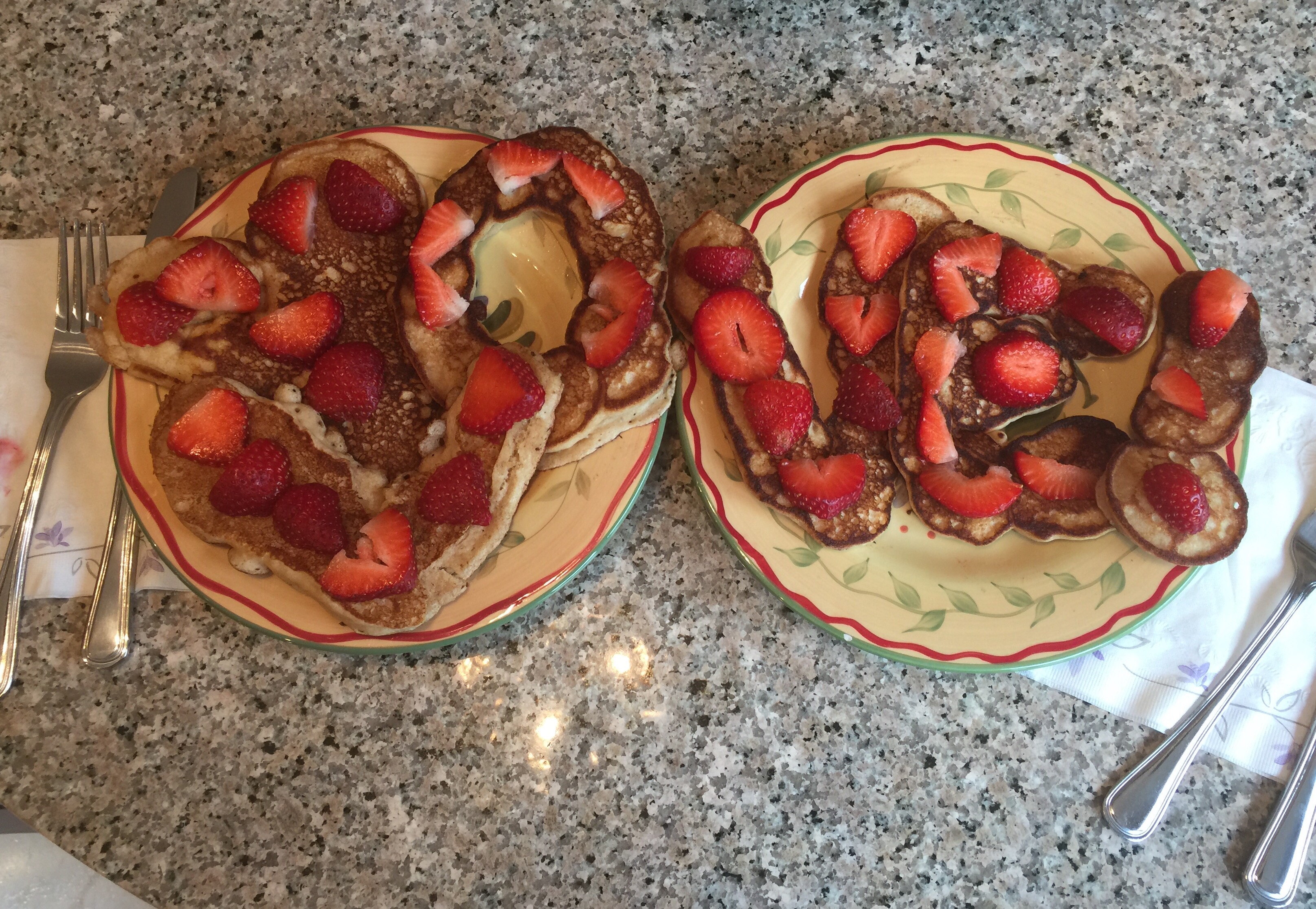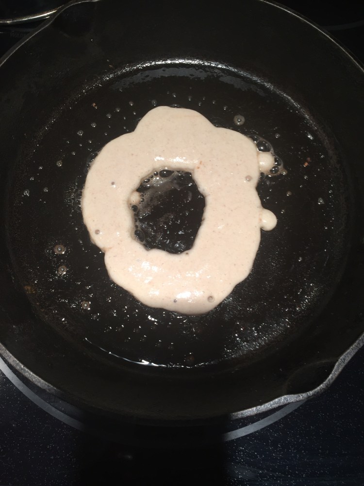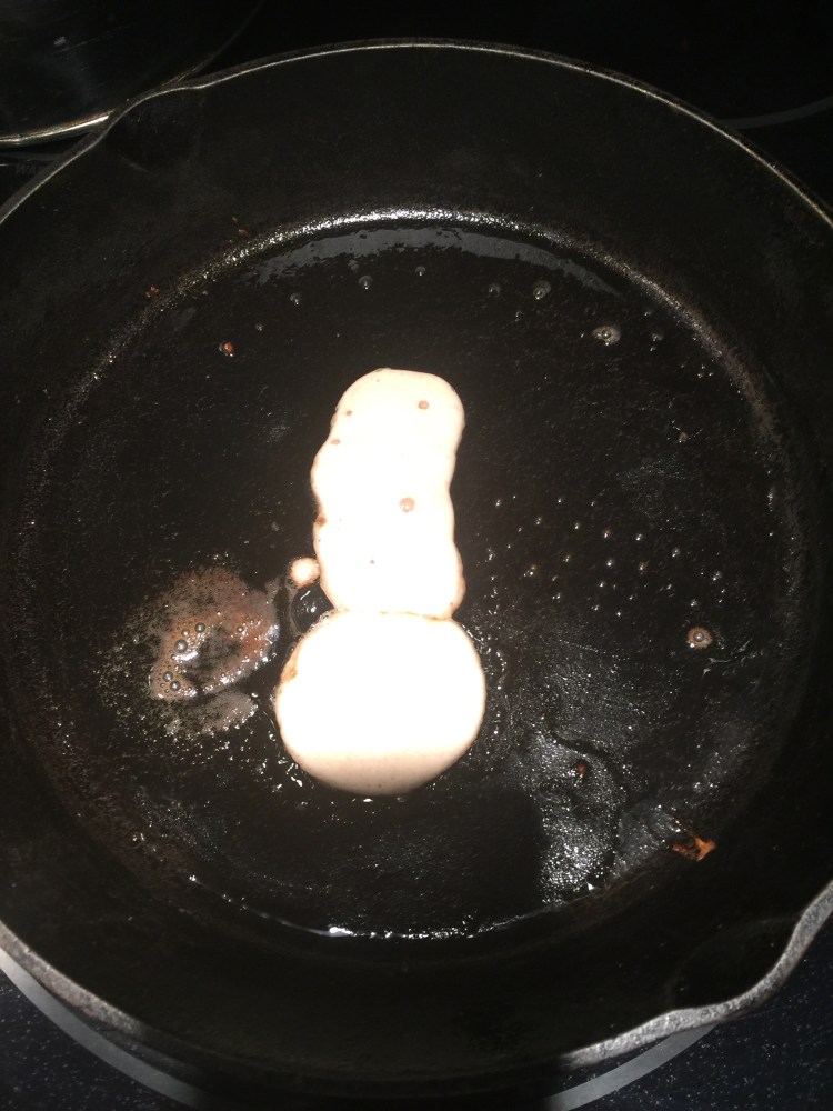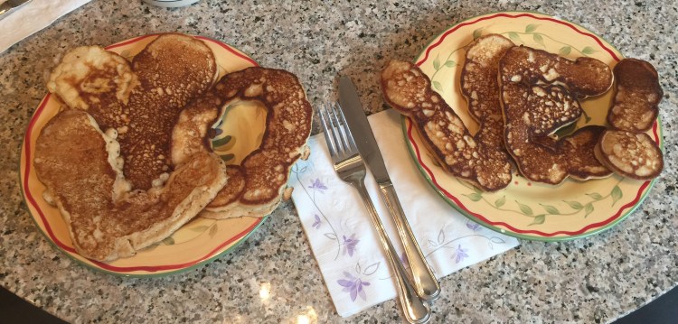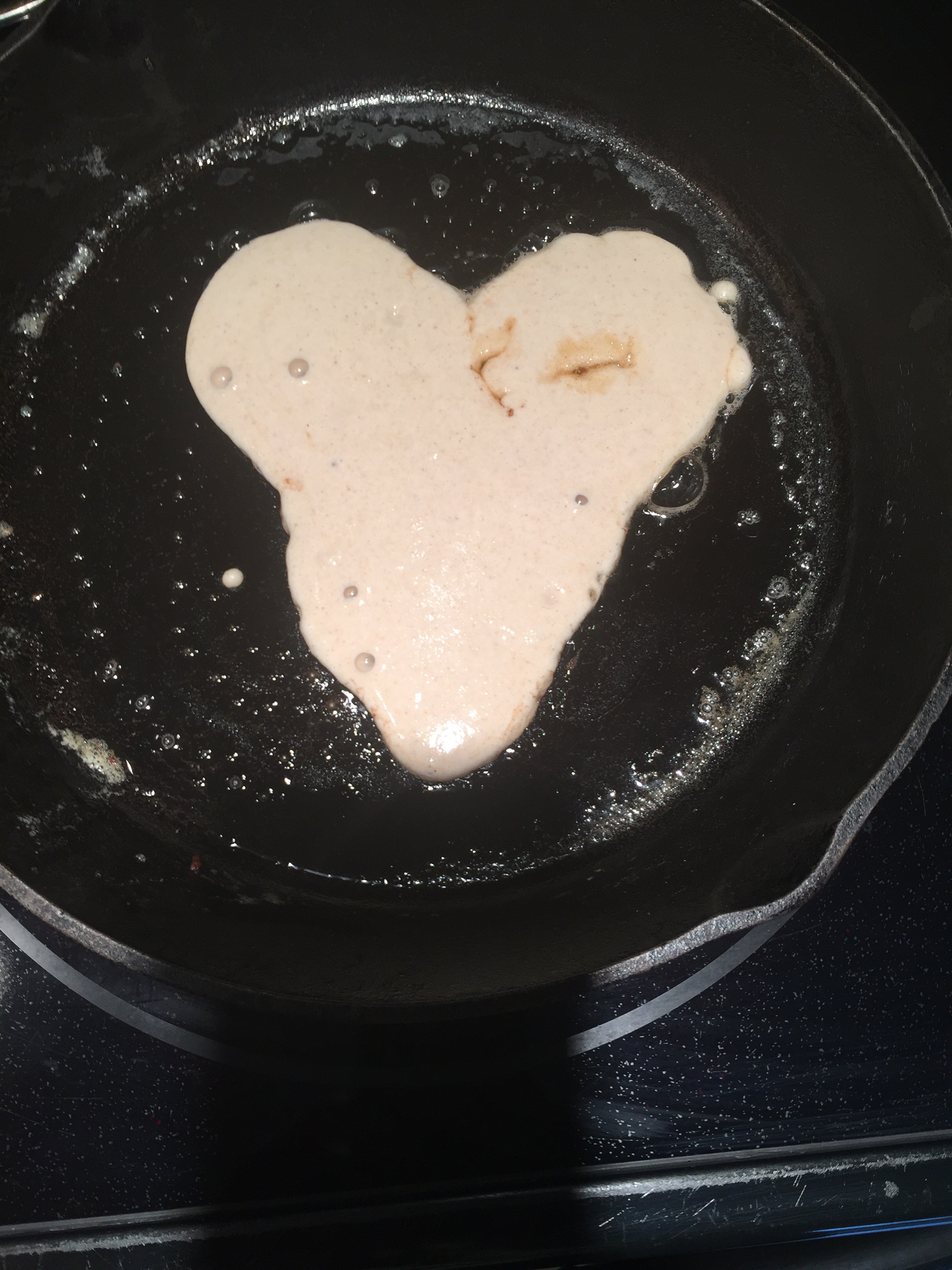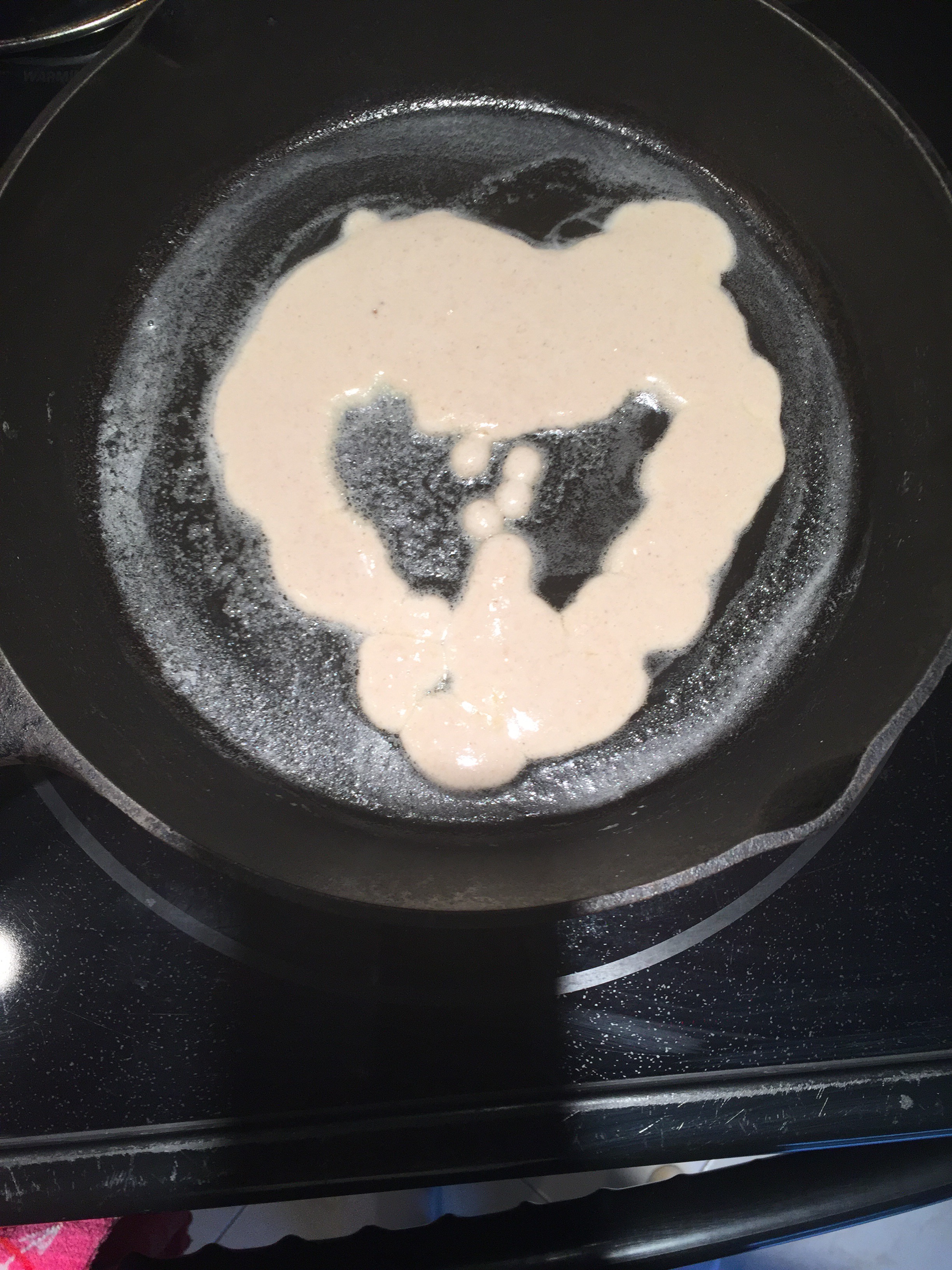 We bought that high protein/fiber pancake mix (Kodiak) from Costco, so we decided to have pancakes this morning for breakfast. John sometimes works from home so while he was on a conference call, I made these pancakes.