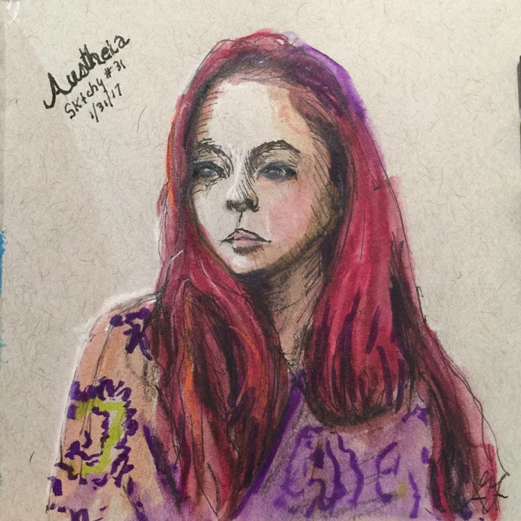 “Austheia” Only two more Sktchy drawings to go to finish this sketchbook! I am debating on finishing off the book tonight so I can start something new for February. Stay tuned.