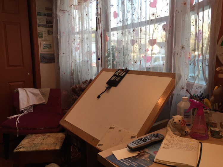 This is my drawing table where I do larger water media based work. The pink chair in the corner is where I take breaks (yeah, gets used more by hubby). The drawing table was a college graduation gift from my friends Marie and Mark (yes, still have it.)
