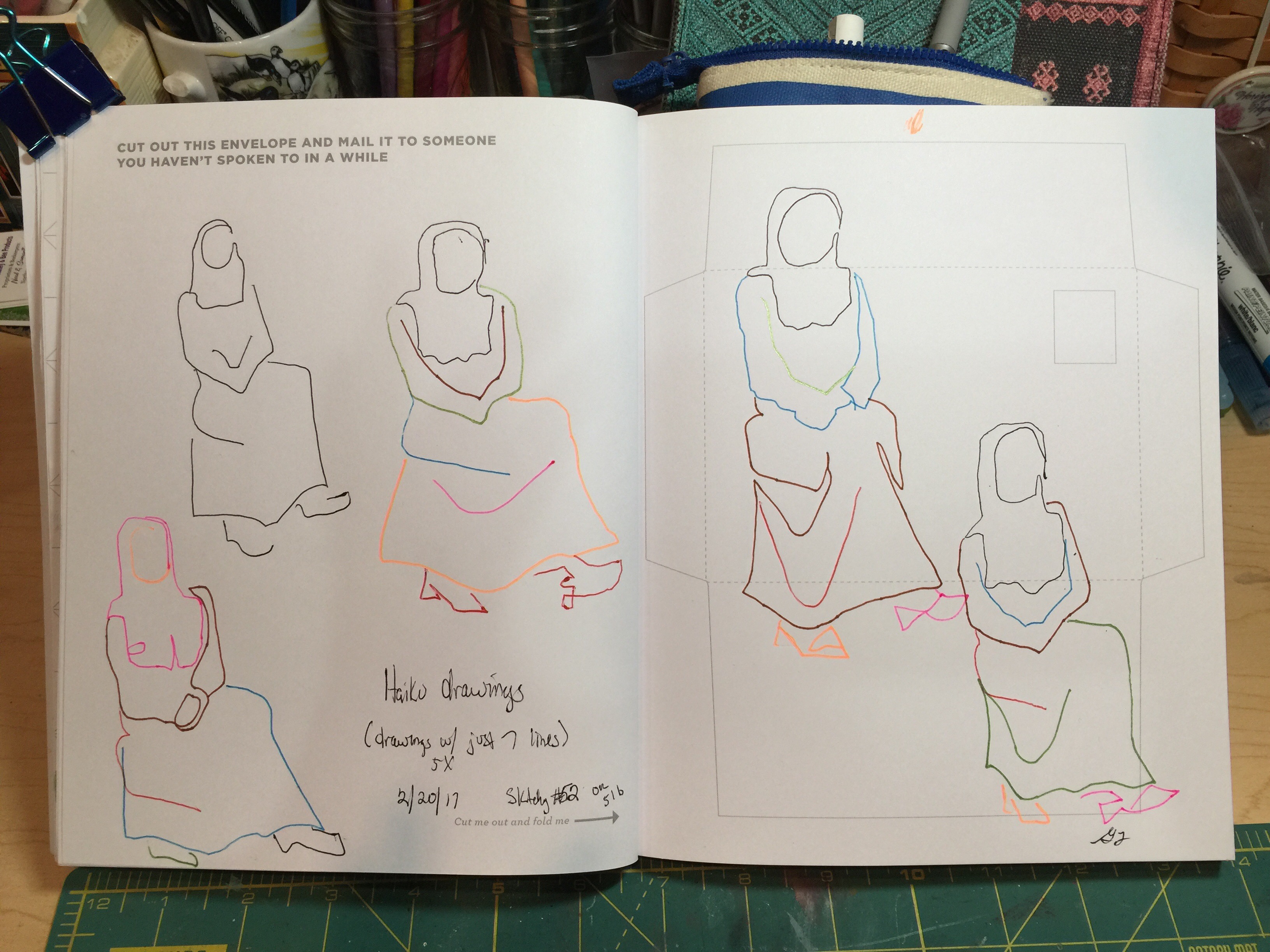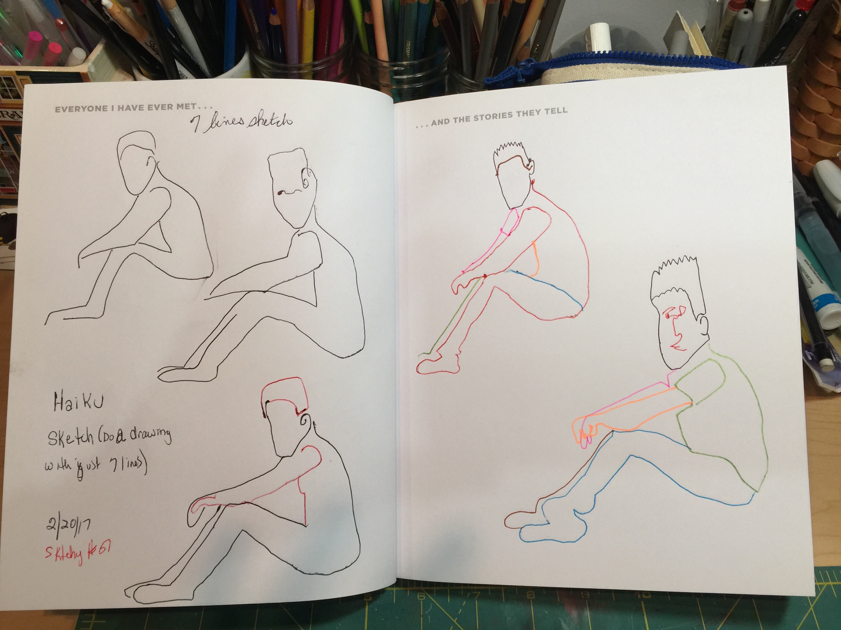 Haiku drawing….exercise where you draw a subject using just 7 lines and you draw the same subject 5 times. I switched it up by using 7 colors so it was easier to actually see all 7 lines….