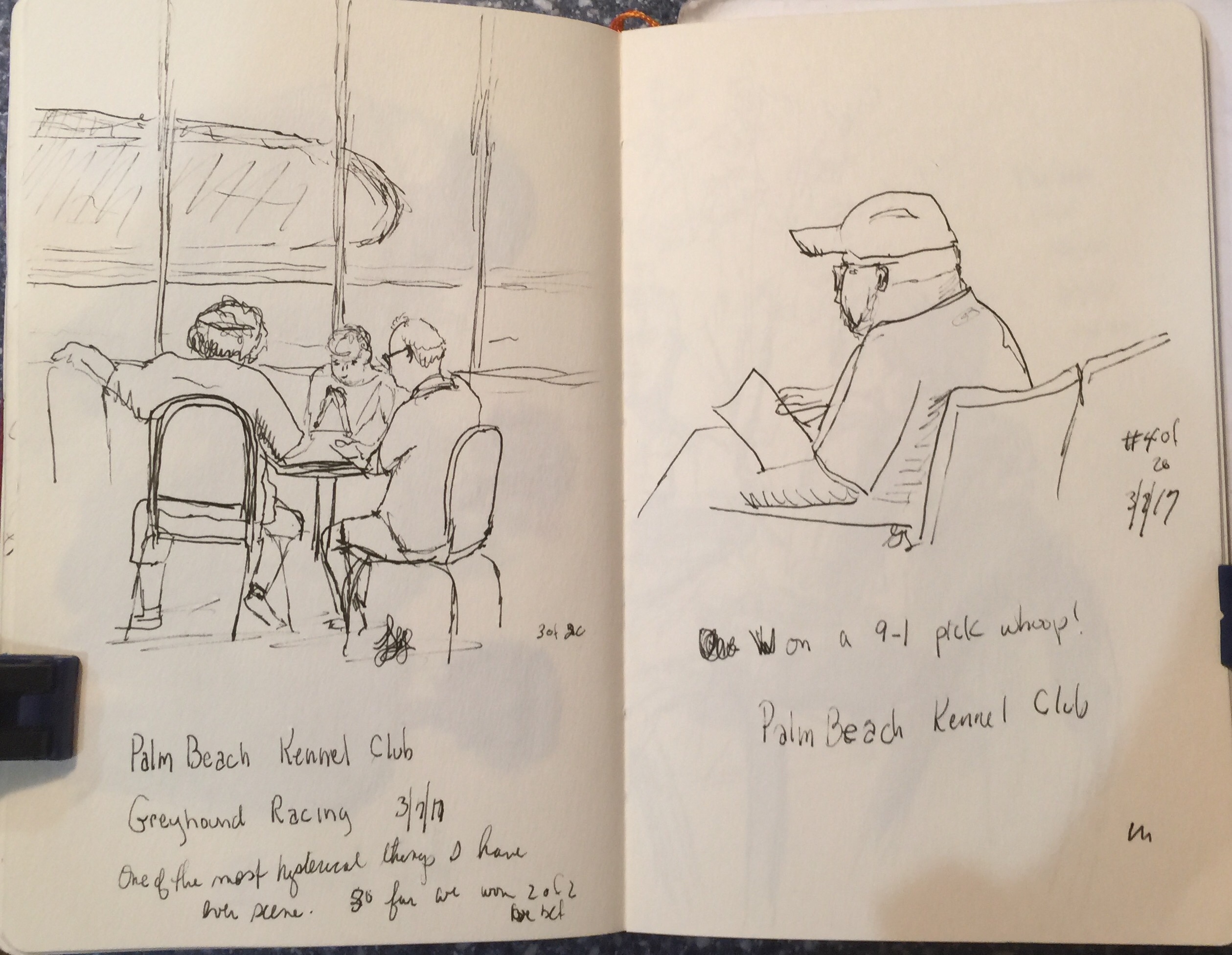 Here are my sketches for today….the goal is to try to 20 per day….I did 22 today….we bounced all over today. We visited a greyhound track today. It was the first time I ever saw dog races….