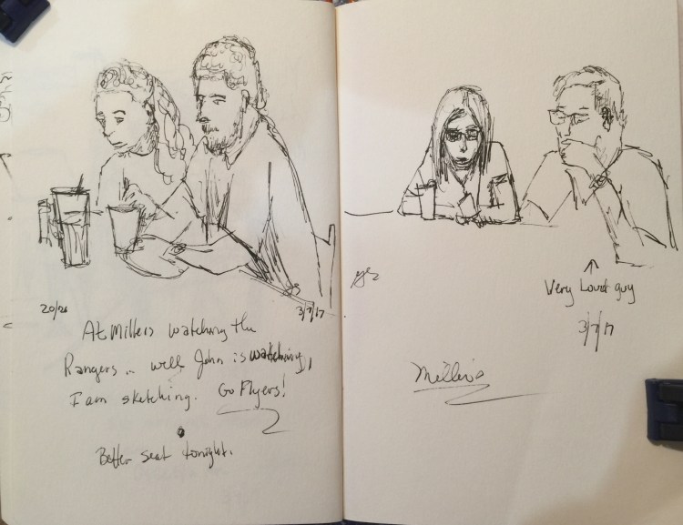 Then we walked back to the car and John drove around looking to see who had the Rangers game on….we wound up at Miller’s Ale House again….I don’t like to hang out at bars but I got to do more sketches while John watched the game.