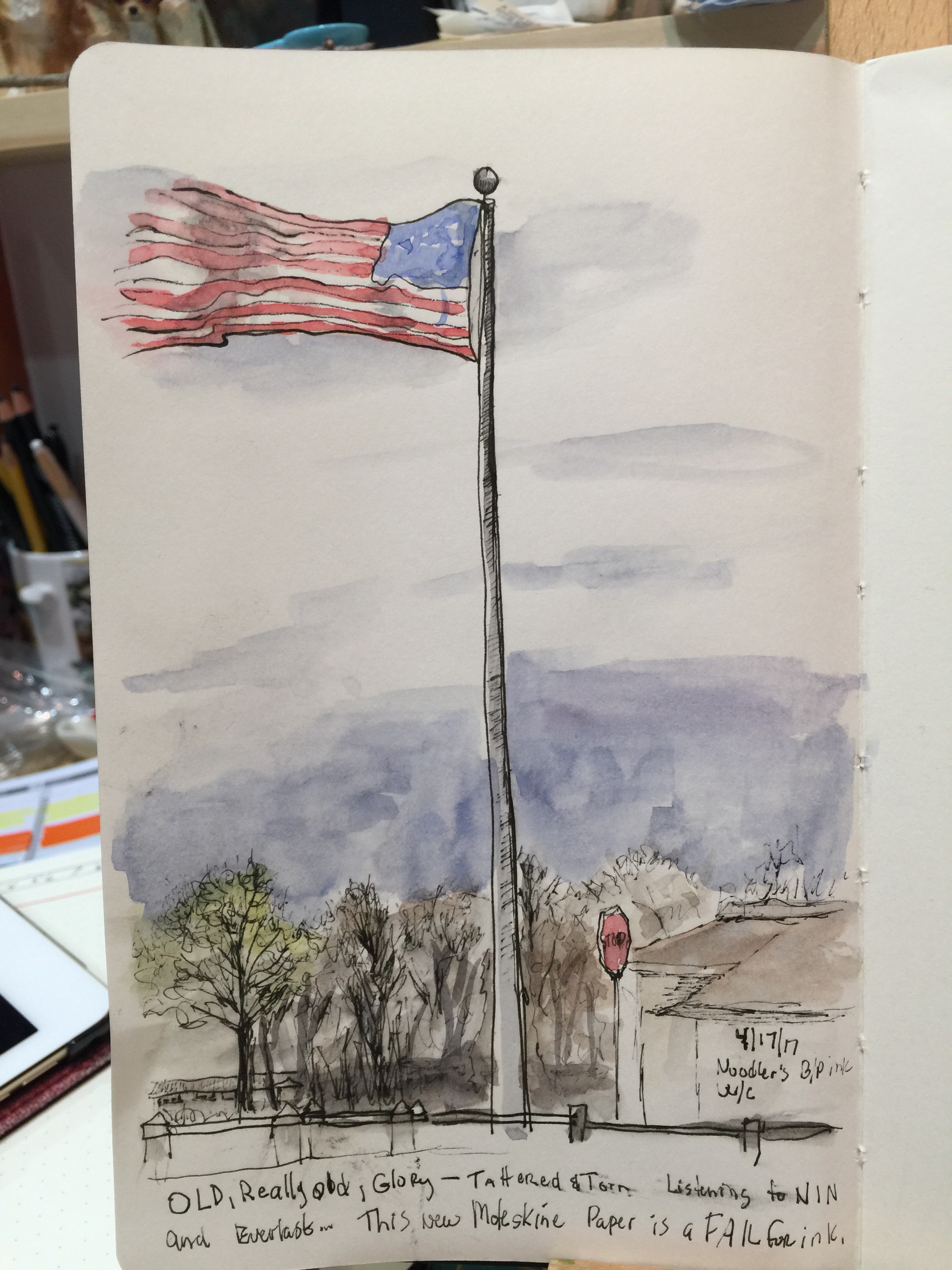 So, today I took my new improved Moleskine out to sketch. I had a small window of time to sketch before I had to go bome and heat up dinner for the family. (Yesterday’s leftovers). I saw the flag down by the bay and I stopped to sketch it. I used my Lamy Safari pen filled with Noodler’s Bullet Proof ink. The ink went on nicely….or so it seemed…I noticed smudges that ended up on the side of my hand. I pulled out my watercolors to add a touch of color and tbe ink smeared. Strike one for the new Moleskine paper. I suspect some causes for the ink bleed issue but further testing with different inks will be necessary.