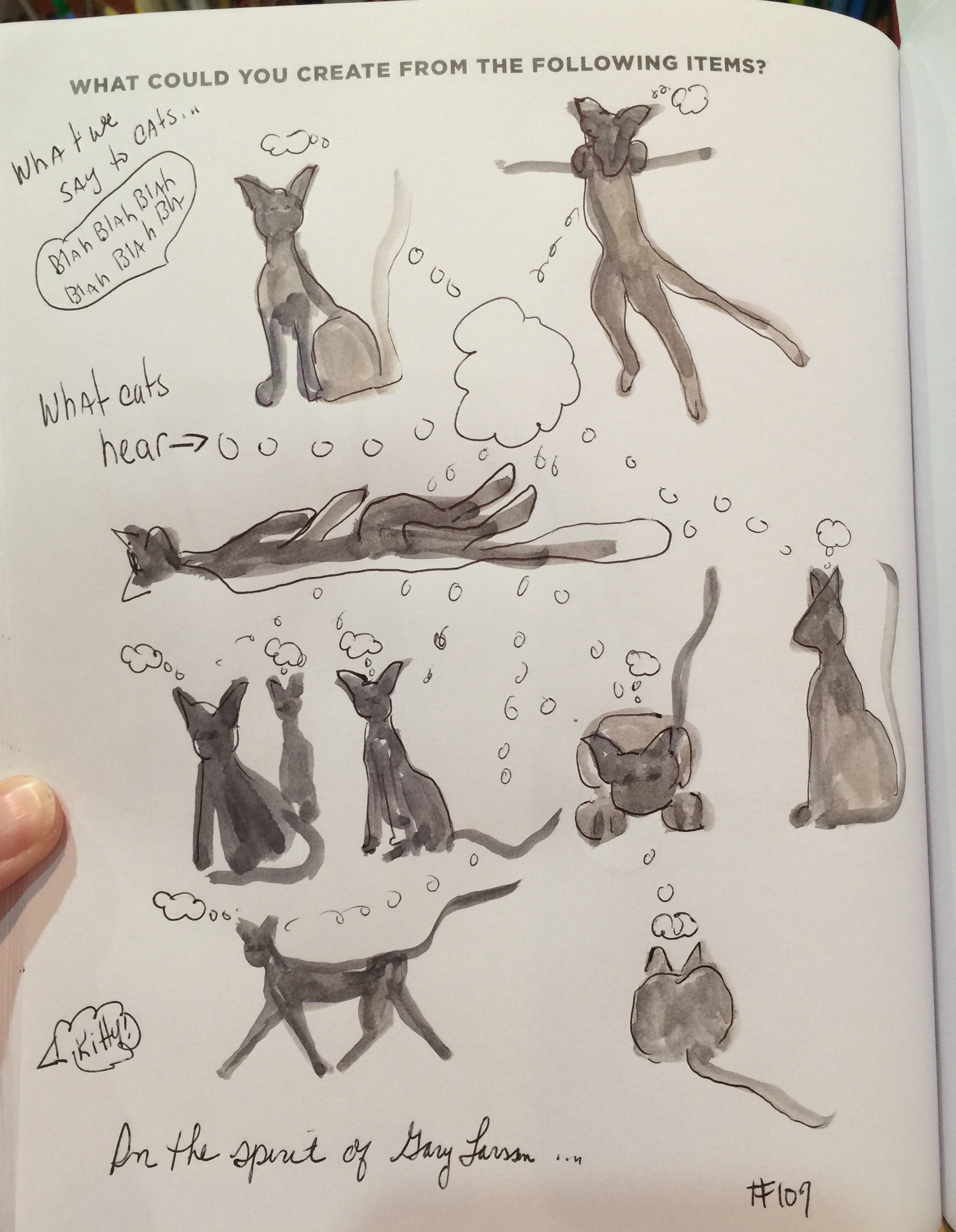 Sketch #2 was inspired by a Carla Sonheim prompt “blah blah blah” which made me think of Gary Larson’s Far Side cartoon…..