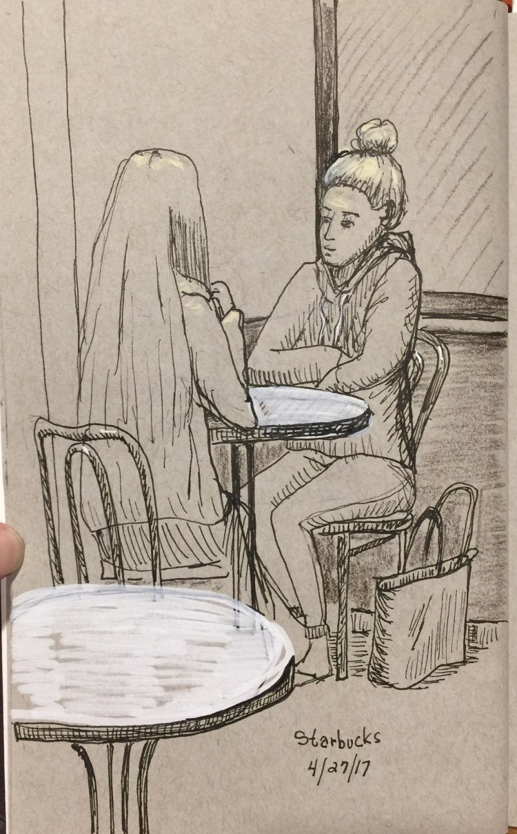 #Sktchy30 #Day27 and I think 116 for the…I have it written down…The Prompt today for Sktchy 30 is success. Success comes in many forms. My high school’s motto, several decades ago….is “Vincit qui se vincit.” “She conquers who conquers herself.” Success is getting out of your own way. Success is being brave. It takes guts to get out of the studio and sketch (or paint) at some place like Starbucks. If you look at the reference photo, the young lady with the ash blond hair caught my eye and I wanted to sketch that hair! Sketching people in public can be a little stressful, you have to really look at them in order to draw them and they catch on after a while. Most ignore me. Some leave. So far no one has freaked out.😂
