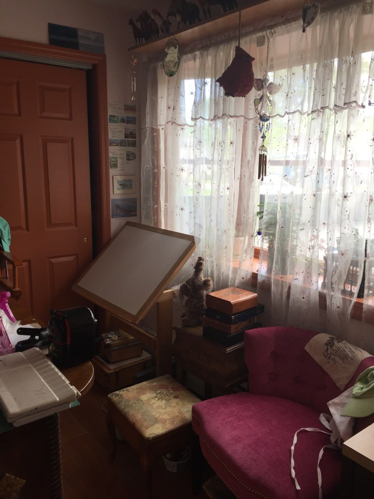 Just left of my desk is my pink chair….John sits there when he comes in to hang out….the footstool is left over from when I shattered my ankle….I still use it. The drafting table is where I do larger water media and such…the room has a nice big window that is facing west so the light is pretty consistant until the sun drops in the afternoon. I adjust the lighting as necessary.