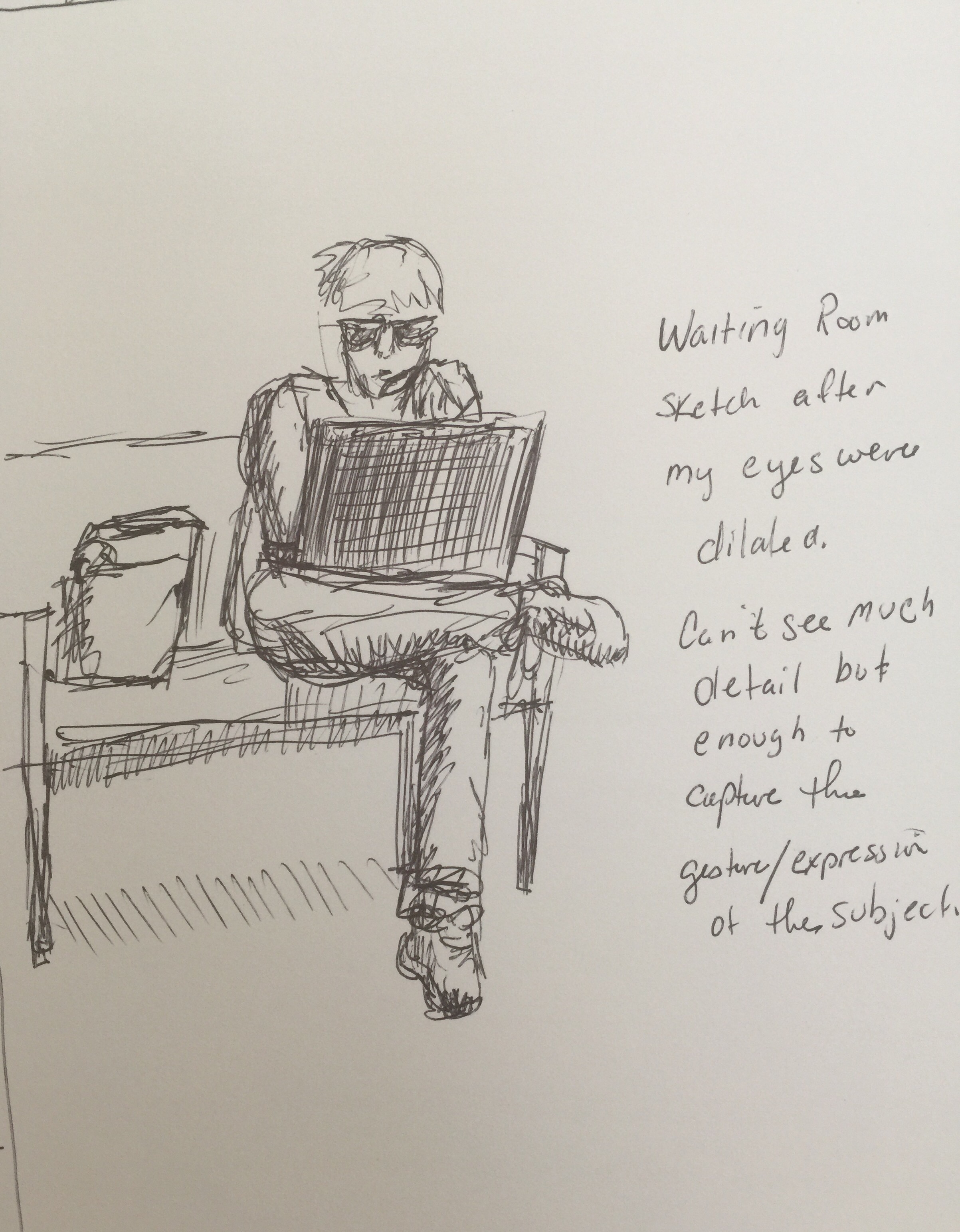 This is a sketch that I did while in that waiting room. It was more keep me busy because I was a little nervous. It was the best I could do with blurry eyes. I couldn’t make out whether the subject was male or female (the drops messed with my vision) but as I was leaving later, I saw he was a boy.