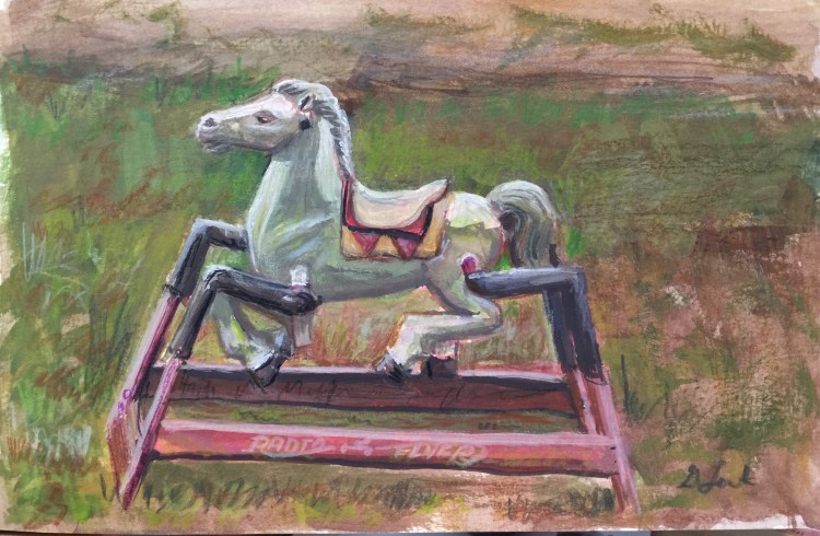 I painted this in my sketchbook last week. I was out with the PALS plein air folks and we went to the Peconic Herb Garden. PHG is a really cool place and is a great place to paint and sketch. I chose this rocking horse that was plunked down in the middle of a clearing. As I painted this, a bunch of chipmunks were running around me.