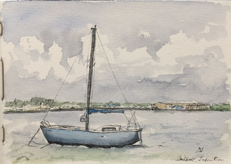 This sailboat was on the south side of the causeway. I liked that it wasn’t moving around, which made it easier to sketch. The sky was doing it’s preparations for the daily thunderstorm. I loved the clouds in Florida. The daily thunderstorms made the sky much more interesting.