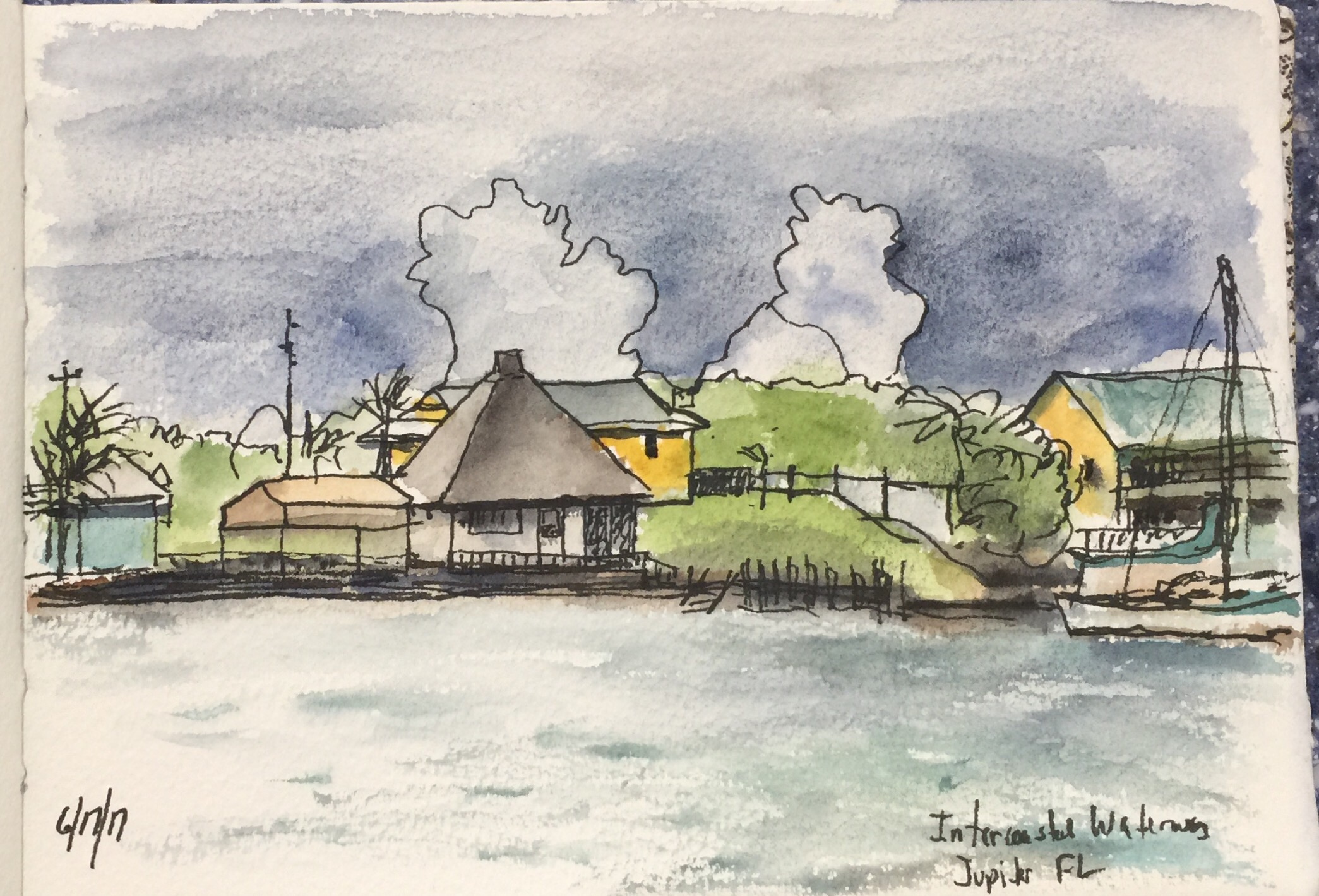 While we were in south Florida, we visited with my sister and her family. She and her husband had gotten a new boat and invited us to come out for a ride. We stopped at a sandbar and I sketched this while sitting on the front of the boat. There were storms around us but it wasn’t raining where we were. Later the storms moved out and it cooled a bit. Overall it was a nice day spent with family.