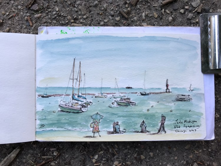Then I moved on to sketch Lake Michigan. I couldn’t leave Chicago without sketching the lake! I was surprised how green it looked, like the Carribbean. It was bustling with activity.
