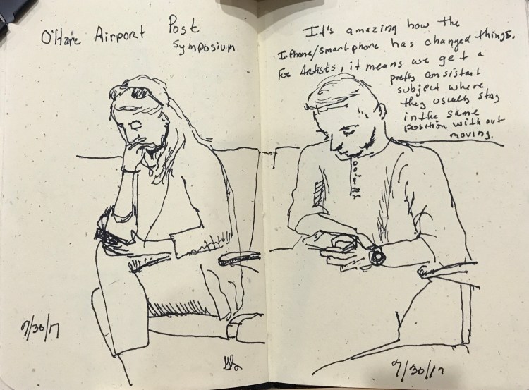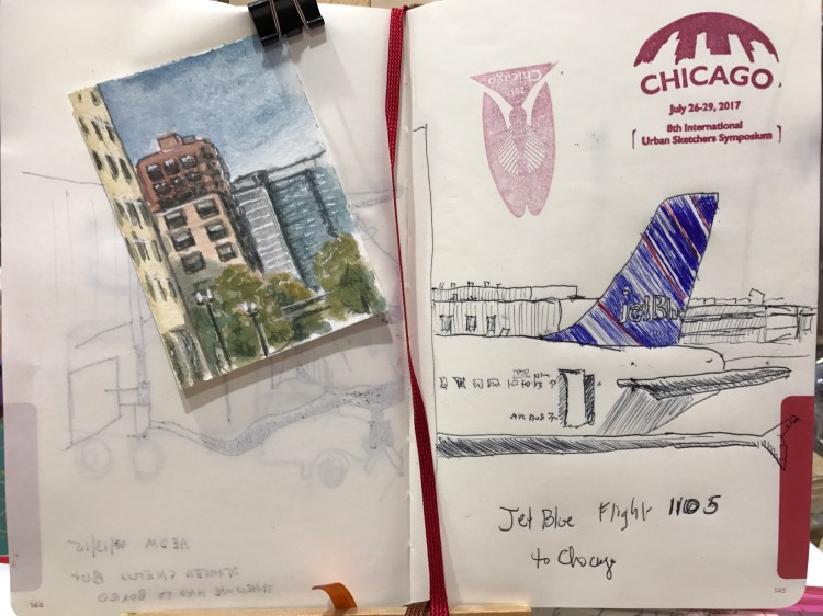 This first sketch was done in my morning pages as I was waiting for my flight for Chicago. I got up so early that I had to do my morning routine at the airport. There was another flight boarding at my gate. These folks were going to Punta Cana. I was sitiing at a table sipping my Starbucks latte and I could see the Punta Cana folks sitting on the runway so I sketched their plane…..and I wondered who was going to the Dominican Republic in the summer? It’s not hot enough here at home?