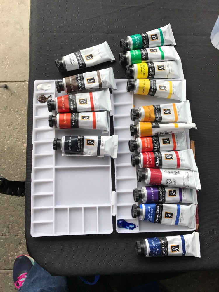 I used a plastic palette today for the casein, freaking awesome idea, wish Inhad thought of it sooner….here are photos of the painting and the tubes of casein..thank you Richeson company! Love casein!