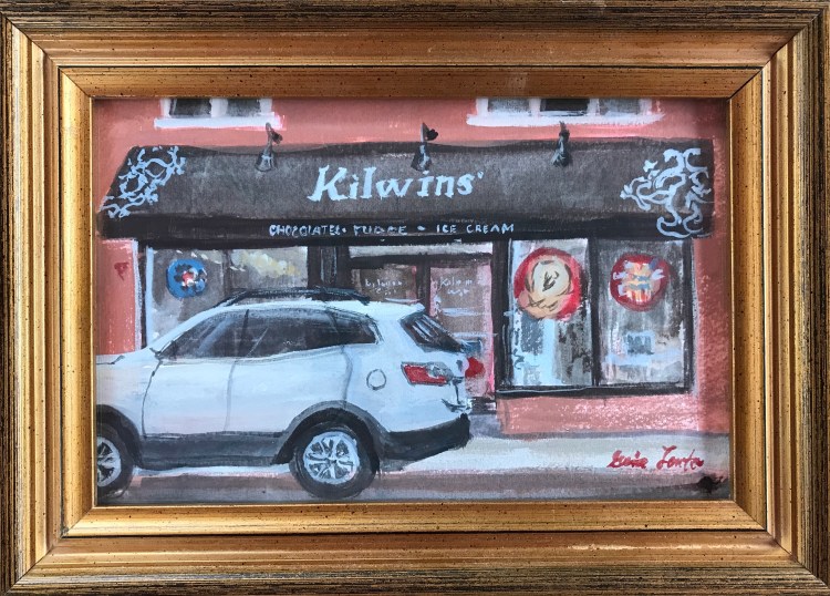 Because I was doing administrative work, I decided to paint in front of the theater with a cleaner medium, casein. So my view across the street was Kilwin’s, a much welcome addition to Patchogue. And easy on the eyes, if you like ice cream and chocolate…