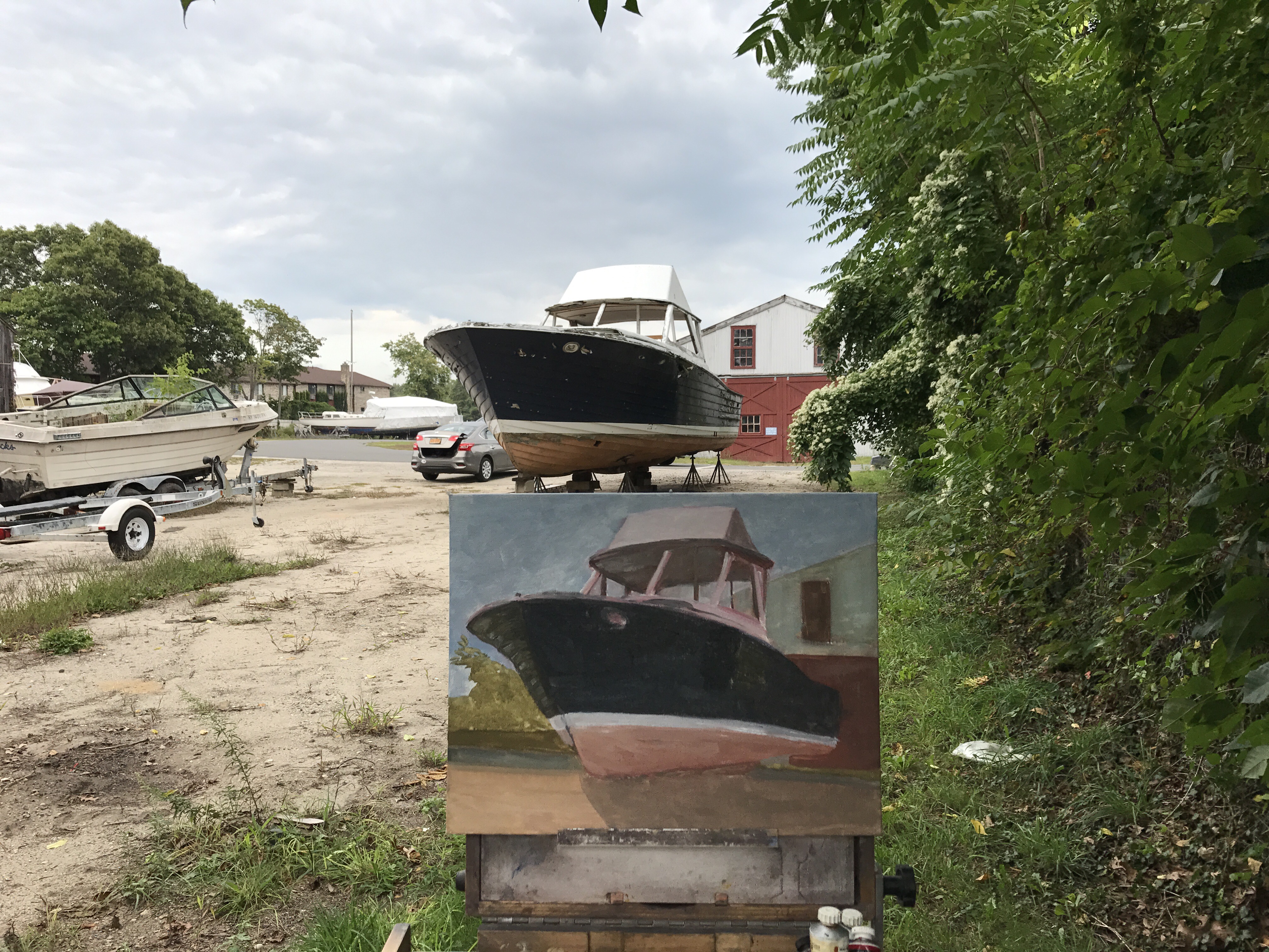 This boat has been put out to pasture. It’s a shame because it looked like it used to be a nice boat. It’s pretty big. Word in the boatyard is that it is being stripped down and it will be burned in a boat burning next month in Sayville. I wanted to capture it’s last days as a boat before it was towed away. I never got to it during the plein air event, but I was able to get out today and work on it. I decided to do an oil painting to change things up a little.