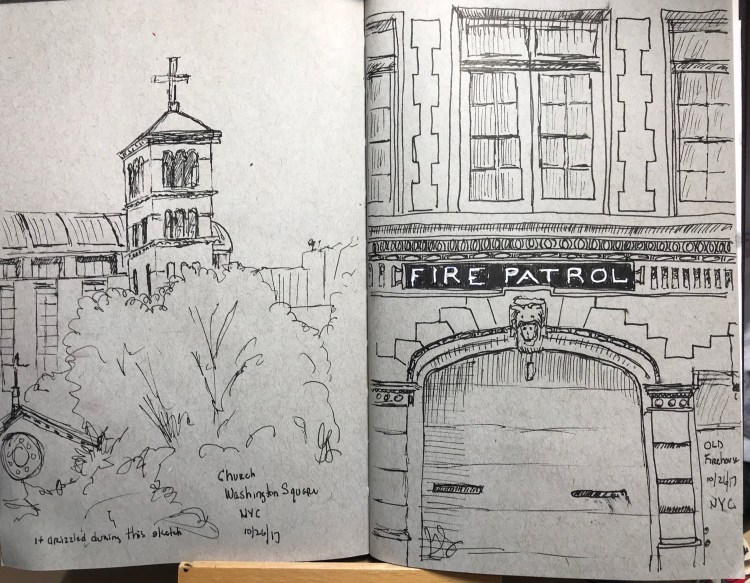 It was getting pretty chilly and by midday, most of us were getting cold. We went to Washington Square for lunch. I sketched the church on the left because I was too cold to eat.