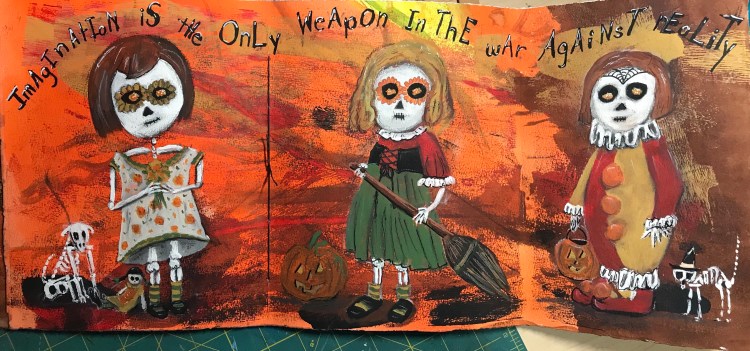 Lately, I have been working in this Teesha Moore style sketchbook. I started with a 22×30 sheet of watercolor paper and I actually painted it several years ago with watercolor on both sides. I had used Halloween kitchen towels as my inspiration, then cut the sheet up for the Teesha Style journal. It sat in my drawer for a few years until I thought of doing zombie dolls. To smoosh the watercolor a bit, I went over the pages with acrylic, then I added my dolls. As you can see, this is 3 page spread.
