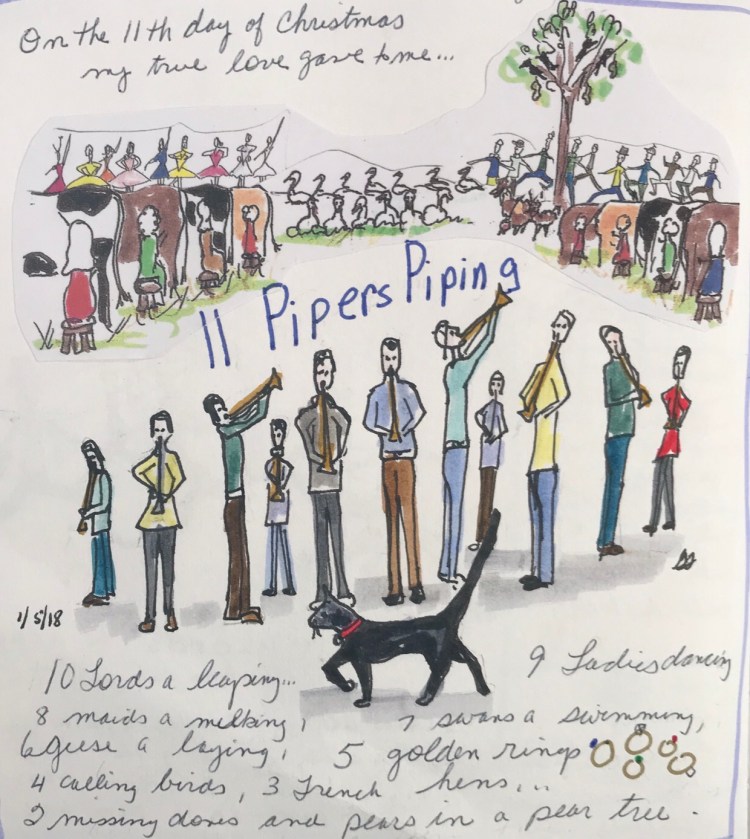 Here’s my 11th day of Christmas sketch, it is getting pretty crowded on the page…..the cat seems to like the pipers.
