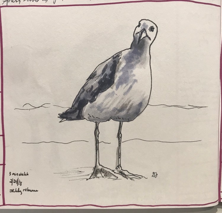 This is a 5 min sketch done in my morning pages. If I can’t think of anything to draw, I go to my saved photos in Sktchy, set the timer for 5 minutes and get moving. I set the timer for 5 minutes because I am doing them in my morning pages and I only want to spend a short period of time doing them. In the past, I would spend a lot of time and then would be behind the rest of my day, so now I set the timer and not use perfectionism to procrastinate. My goal here was to capture some of the line quality that I saw in Hockney’s sketches. And I love sketching sea gulls!
