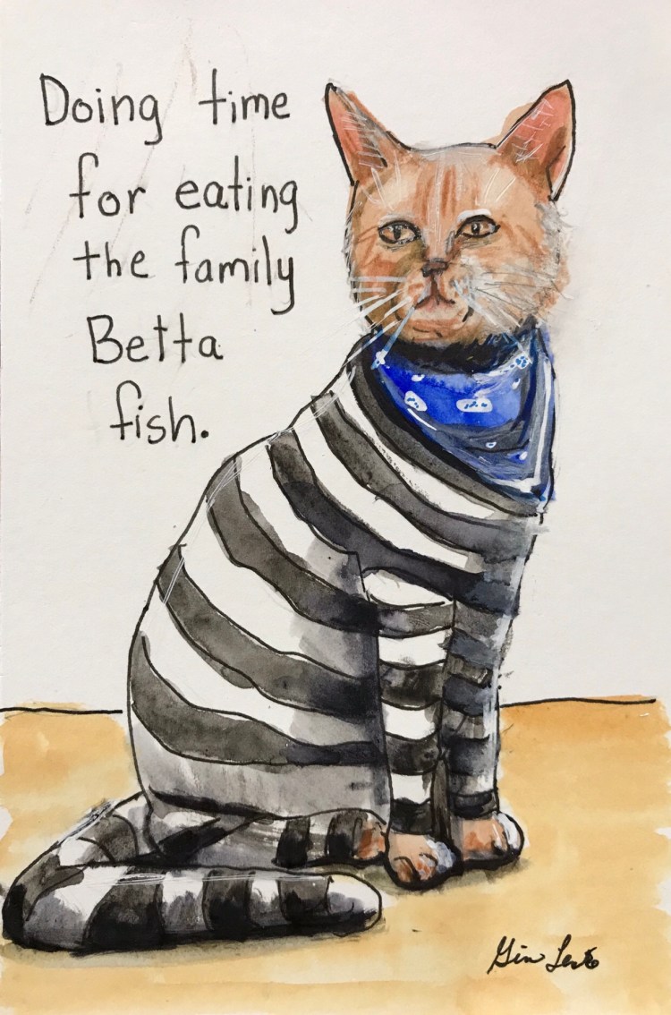 I take Carla Sonheim’s year long 365 course. Every day she gives us a new prompt. Today’s prompt was a random pick where she picks two words out of a hat. I had to chuckle, today’s random words are cat and bars. At first I sketched a cat behind bars, but then this idea popped into my head.