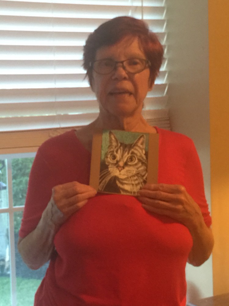 This weekend has been quite a full one and I actually forgot to post yesterday. I was working hard on some magnets that I was making out of my sketches. I spoke to my mom as I was doing them. She is all excited about the cats she received in the mail and she was especially excited about one that she received from an artist in the Netherlands, Tamara Linssen. I met Tamara on the Sktchy App. Tamara has been following my cats that pop up on Sktchy. Tamara wanted to send my mom a card, too, so I emailed her my mom’s address and she received it in the mail last week. I live 3 hours from my mom so I had been waiting for my sister to take my mom’s photo with her card from Tamara. My mom was especially touched by the kindness of a stranger many miles away. She has dementia, but she was aware that the card was special because someone she didn’t know cared enough to make and send her a card.