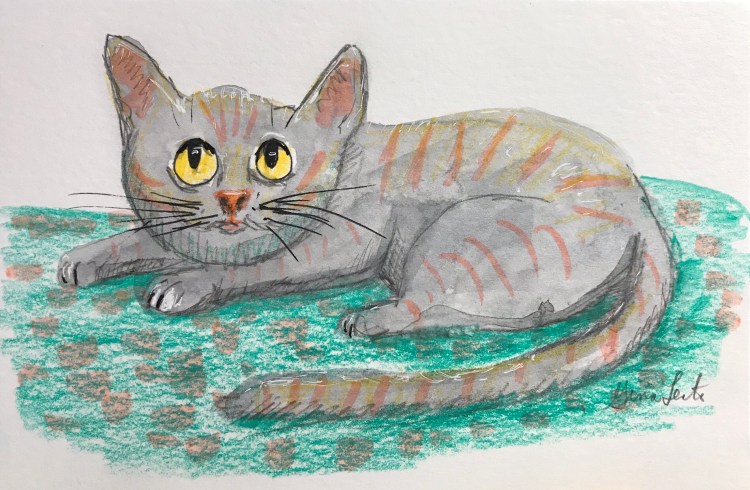 One thing I like about doing these kitty postcards for my mom is it gives me a chance to play with different media and techniques. Today’s kitty is one of those experimental kitties and I really enjoy doing them. It’s more about mixing things up to see how it turns out. This even includes what colors I choose, and which media, to see how they interact.