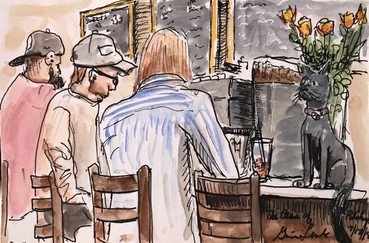 While we were sipping our beverages, I sketched this and added my “trademark” kitty, Cleo. Cleo celebrated her 3rd “birthday” aka we “found her” day on the 17th. We weren’t looking for a cat but she found us. We brought her home as a tiny street kitty. Now she’s Cleopatra.😂. Cleo is enjoying her life in Florida. Maybe my daughter will give her a bug to play with.
