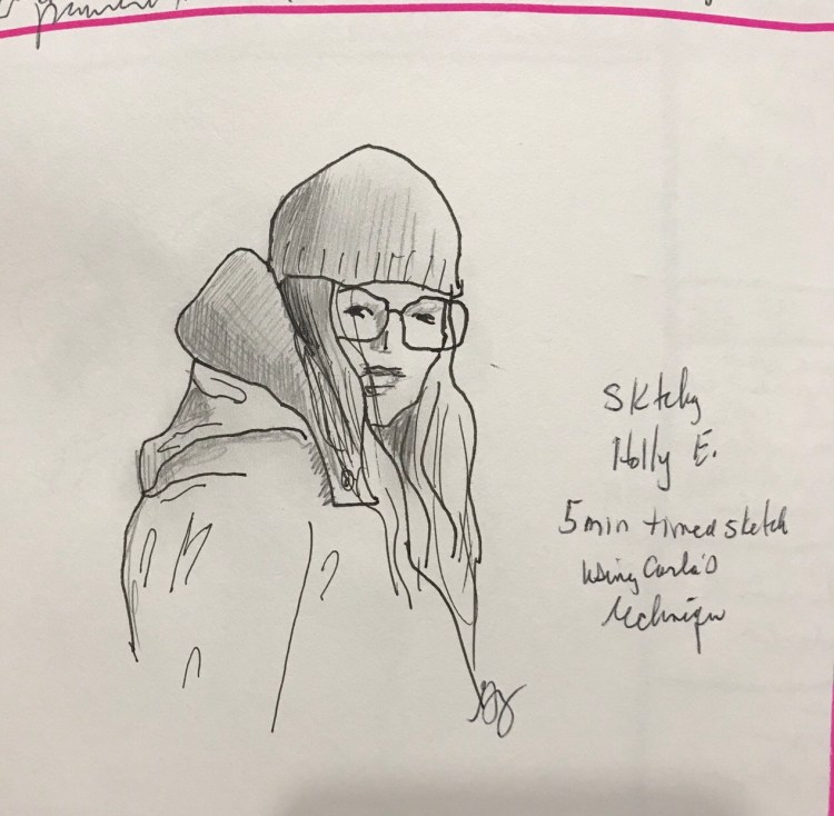The technique I used for this kitty is a mixture of ink and pencil. It was demo’d in Carla Sonheim’s 365 workshop of prompts. We used the technique with chicken sketches but I used it for this kitty and a 5 minute Sktchy portrait.