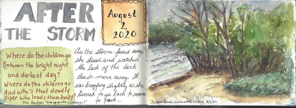 We sat in the car by the Indian River as Isaias was trekking north. I sketched this to the patter of raindrops and to “Fluffy” the comedian, being totally snarky about his show in Delhi.