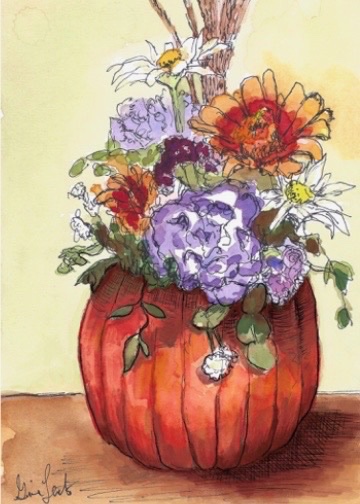I have been updating some of my work digitally. This was always one of my favorites that I did several years ago and I decided to give it a digital facelift. I purchased the bouquet in the pumpkin during a festival in Cape May and did the sketch immediately after I took it home. I thought it was such a great idea. I would never have thought to use a pumpkin for a “vase.” I don’t know what the blue flowers are but I always wanted to grow them. There used to be a U-pick place in West Cape May where you could cut your own flowers. Don’t know if it is still there.