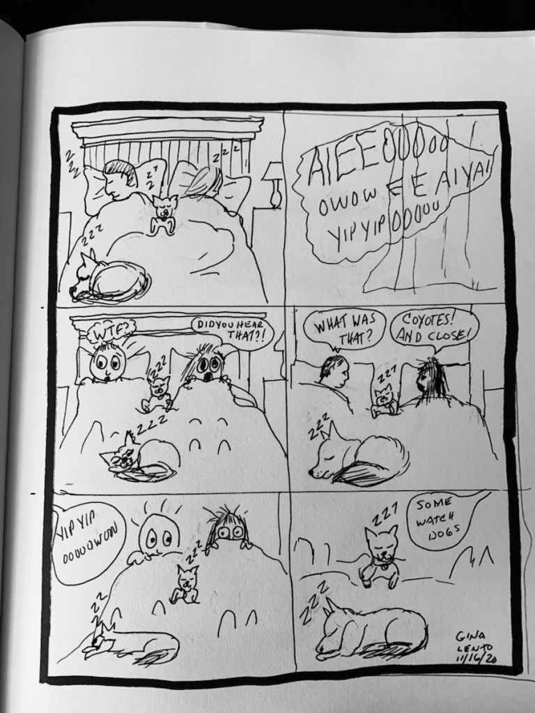 That sketch pretty much sums it up. The howls were very disconcerting. There is something primal about how we reacted. I love wildlife of all types and I am all for living harmoniously. That was the first time I heard coyotes in the dark and it took me off guard. The neighbors told us coyotes lived in the area. And bobcats. Oh. and a Florida panther is in the area, too. Even as I write this I am listening. Yesterday people put their trash out so they were probably doing a trash raid and the raccoons will get blamed for it.