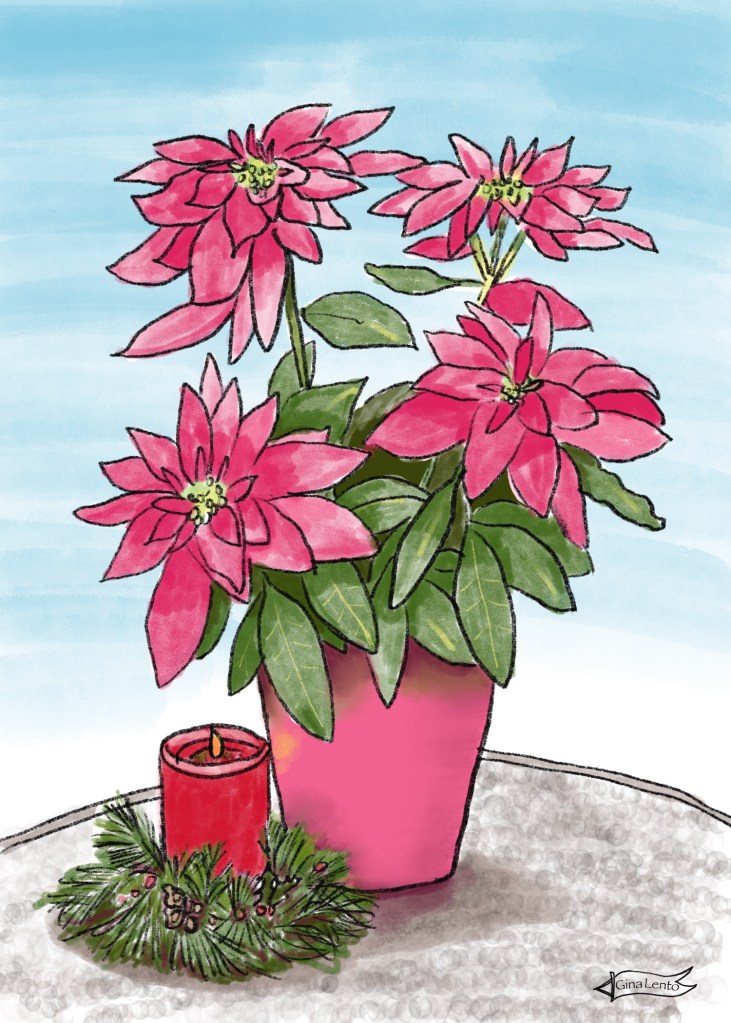 Home Depot had quite a few stunners and we have them around the lanai, pool and two in the entry way. This one is on the table near the pool. I could have picked many different ways to interpret the prompt “poinsettia” but this gave me the excuse I needed to immortalize one of them and do it the old fashioned way, with a sketch.