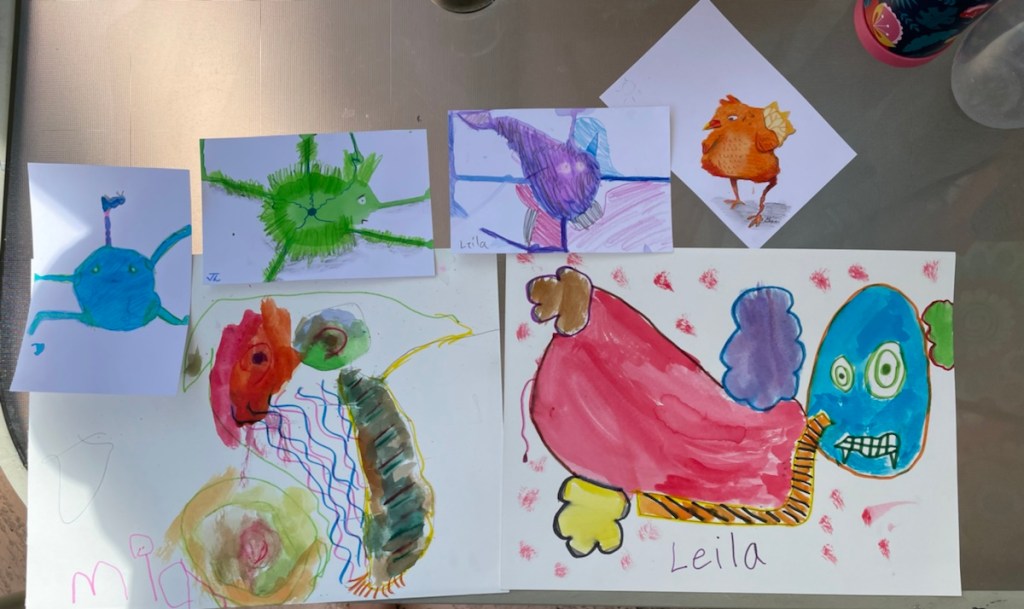Four of the five grandkids are here for a visit. They wanted an art lesson from Grandma. Fortunately, Carla Sonheim has done many Children’s’ art weeks so I was able to use the Picasso Elephant lesson with my four grandchildren ages 7 and 4 (with no sets of twins).