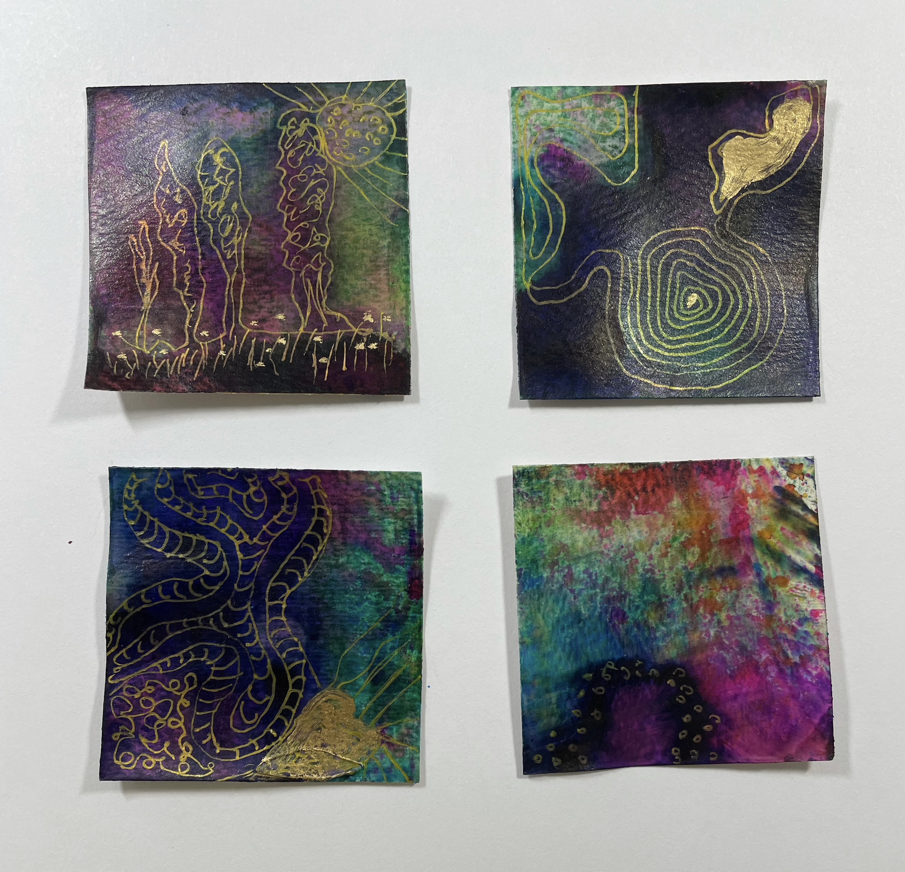 and I cut it up into the 2×2 squares. I sprayed the squares with spray Ink and sealed them after they dried so they wouldn’t reactivate. They reflect the light a little and my scanner wasn’t handy so this is just an iPhone photo of the 4.