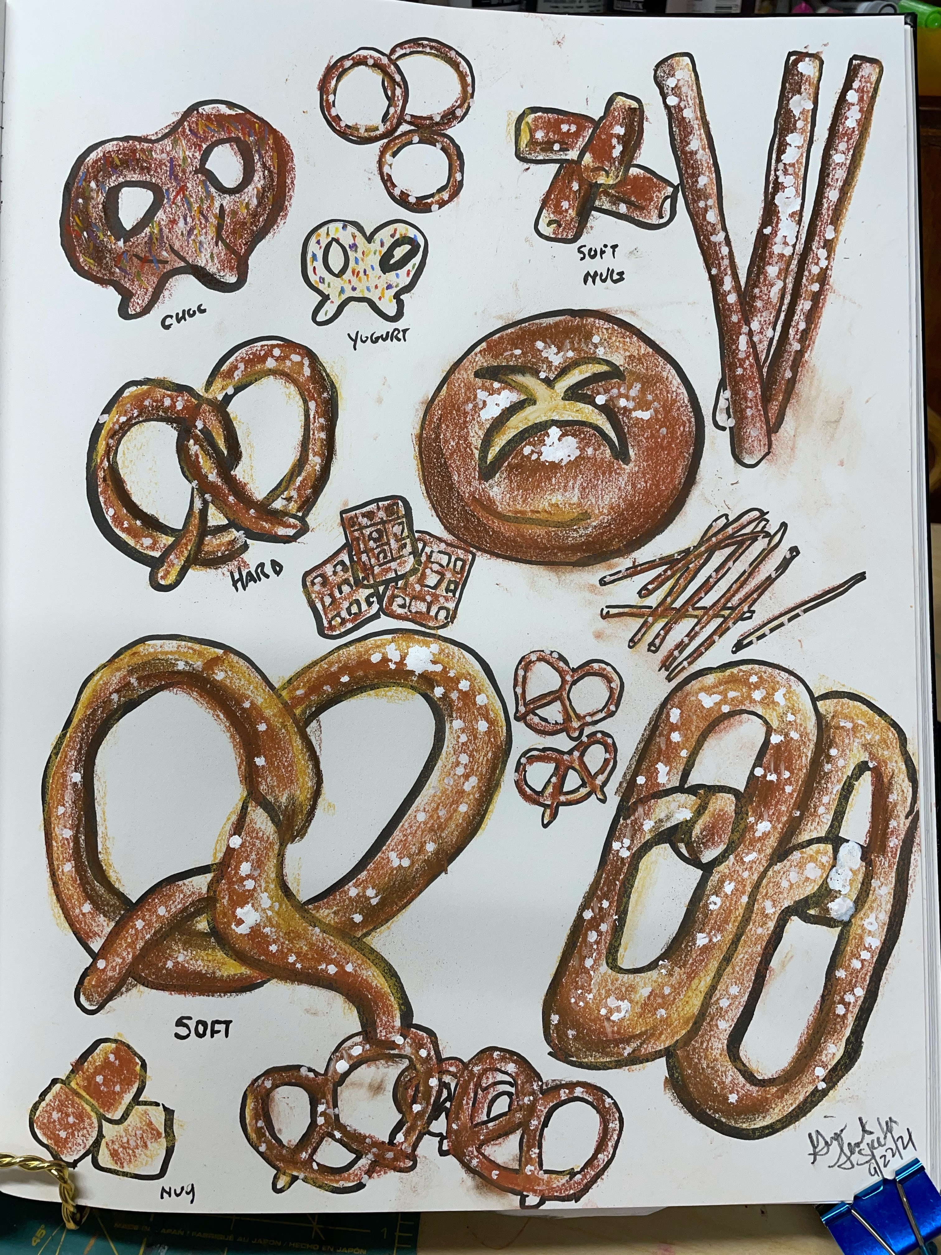 I sketched a bunch of Pretzels. Tried different versions. Tried pastels, tried gouache….