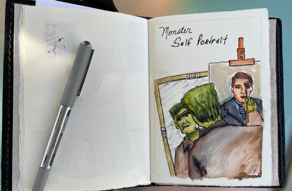 Today’s sketch is based on my interpretation of last month’s Drawlloween list. The first day was “Monster Self Portrait” which, I think the intention was to make a monster self portrait of ourselves, but that light bulb came on and I remembered the Norman Rockwell self portrait. I recently did a sketch of Cary Grant and I laughed thinking about Frankenstein painting his self portrait but it looking like Cary.