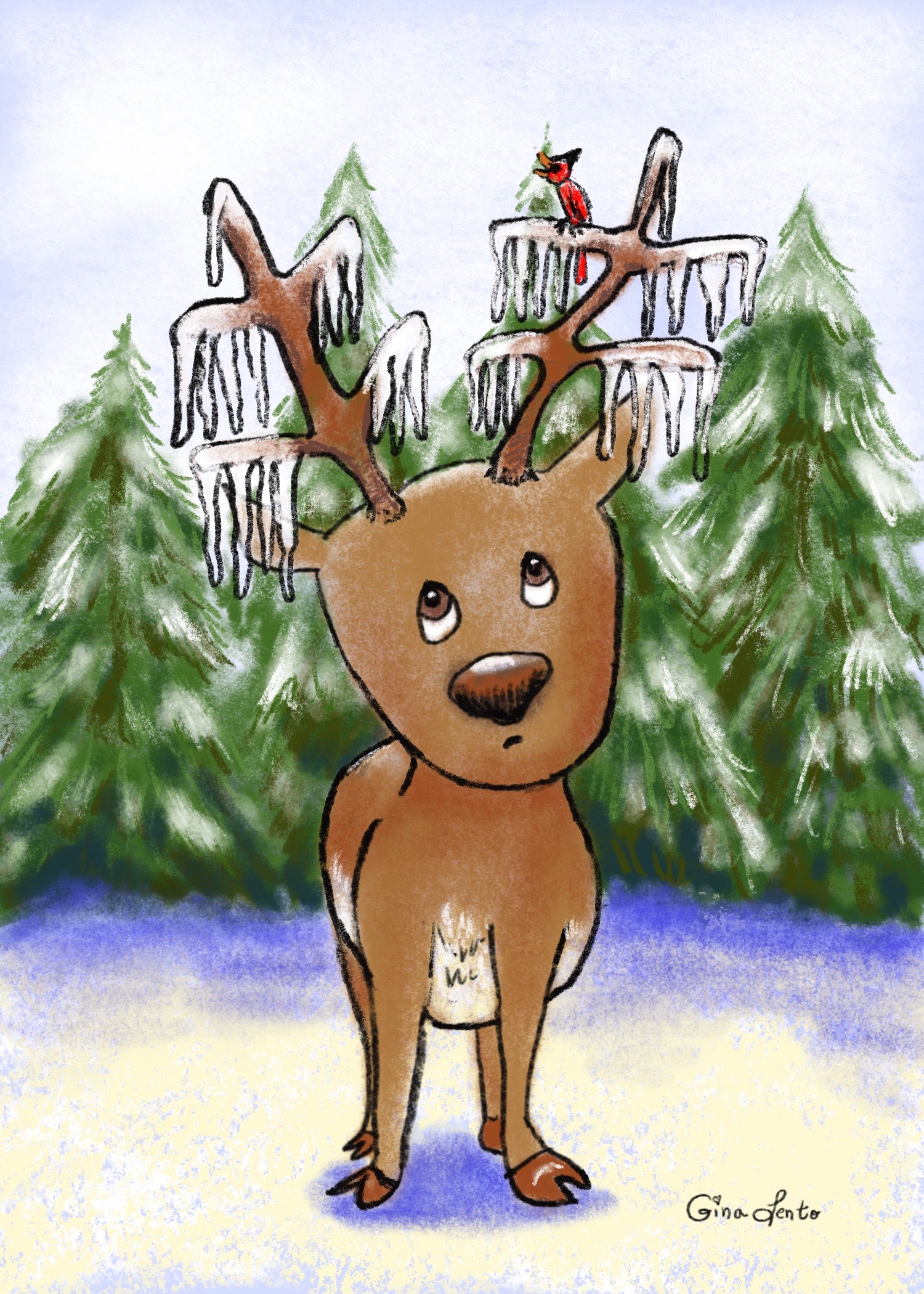 This little reindeer character has been hanging out in my sketchbook and my iPad. Today he has a little bit of a frozen antler problem.