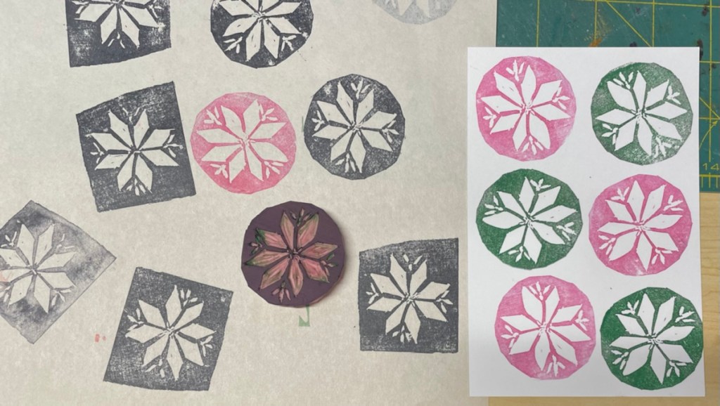 Today’s stamp is also included below. It’s a stylized poinsettia. New blades came from Amazon which made a significant improvement in my cutting skills, LOL.