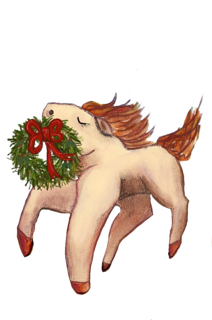 Today’s prompt is ‘horse.” I trained Lucy to carry a wreath instead of her flowers. I also made an handmade ornament out of her that looks really cute on the tree.